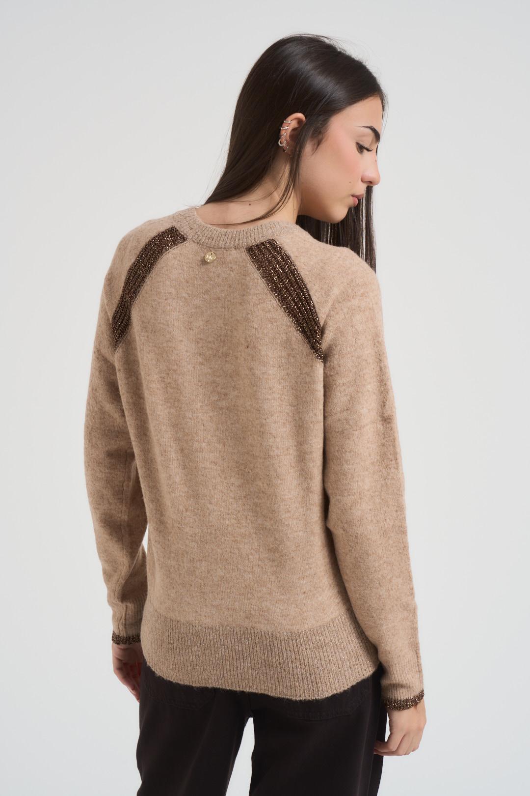 MARKUP Maglia donna girocollo beige. Modello con dettagli in lurex marrone, regular fit con dettagli a costine, giromanica in lurex marrone. Composizione: 53% Poliestere, 39% Acrilico, 5% Lana, 3% Elastane. La modella è alta 172 cm e indossa la taglia S.