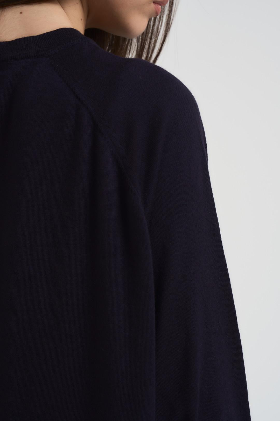 KAOS Maglia donna girocollo blu notte. Modello a manica lunga, con dettagli a costine. Composizione: 100% Lana. La modella è alta 172 cm e indossa la taglia xs.