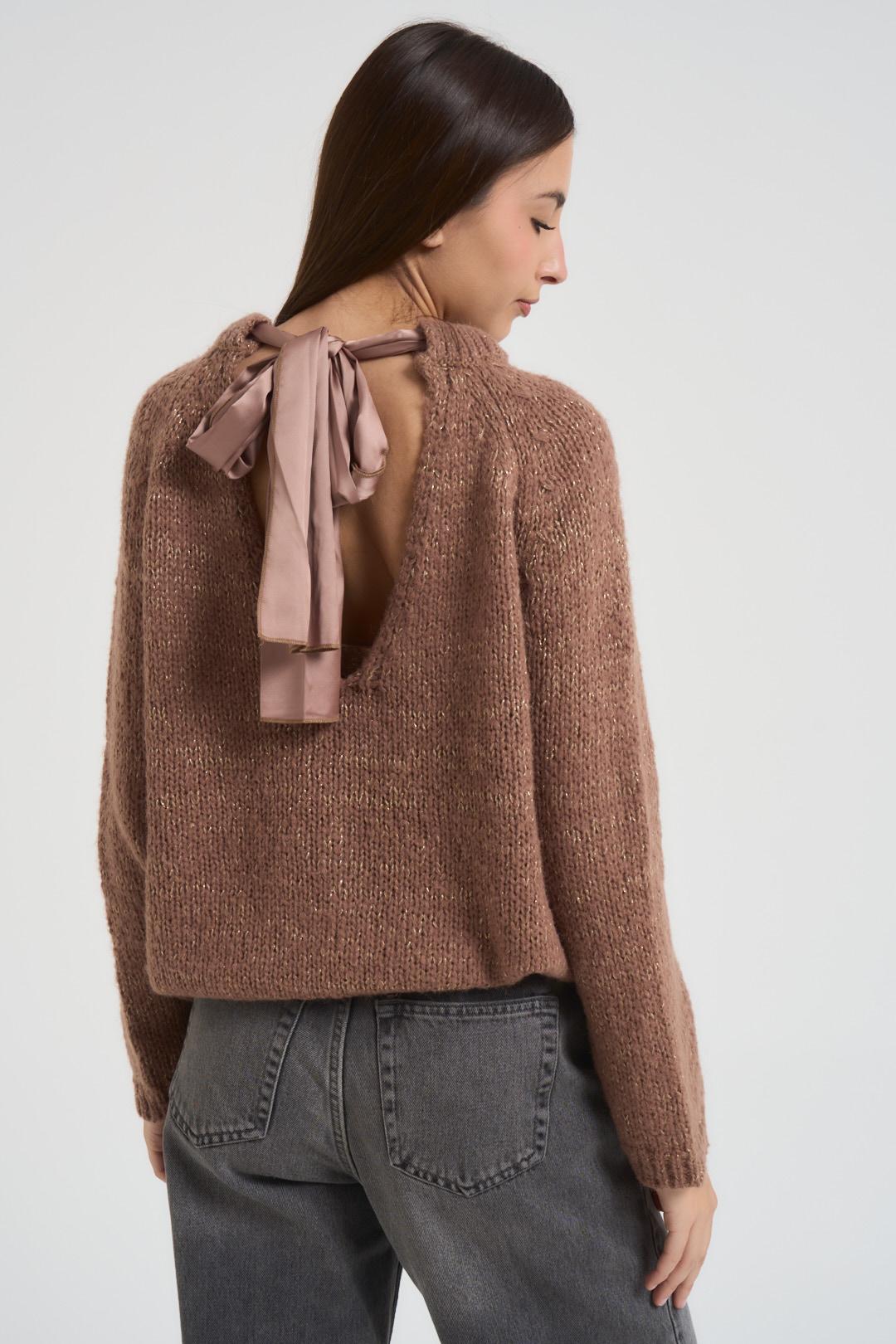 ONLY Maglia donna girocollo cammello. Modello con lurex silver a manica lunga con dettagli a costine e dettaglio fiocco. Composizione: 39% Poliestere riciclato, 30% Poliestere, 24% Viscosa, 7% Fibre Metalliche. La modella è alta 176 cm e indossa la taglia S.