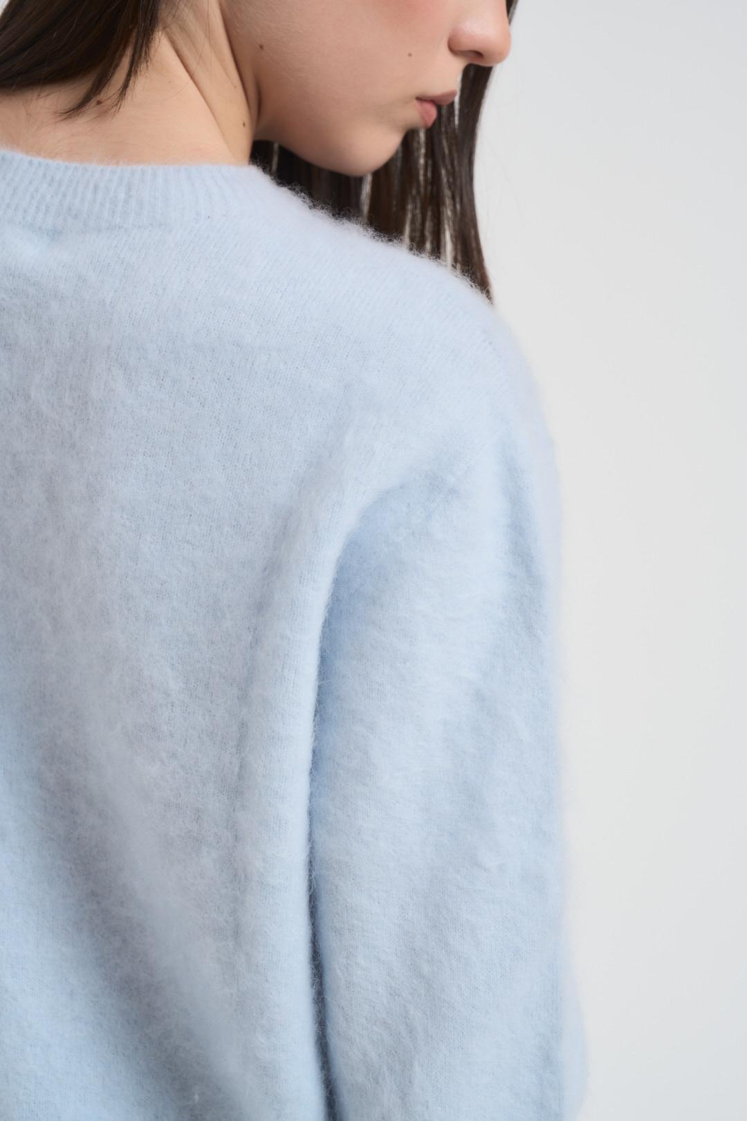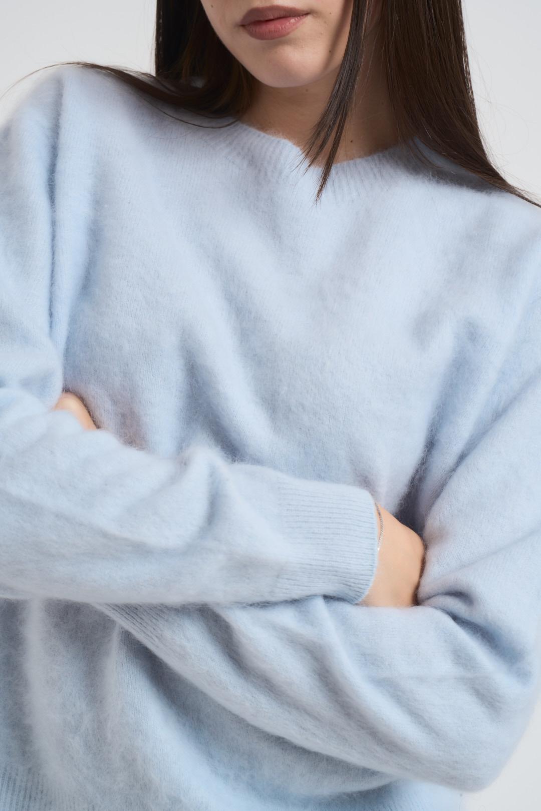 KIKISIX Maglia donna girocollo celeste. Modello regular fit, manica lunga e orli a costine. Composizione: 89% lana 6%cashmere 5%seta. La modella è alta 172 cm e indossa la taglia UNI.