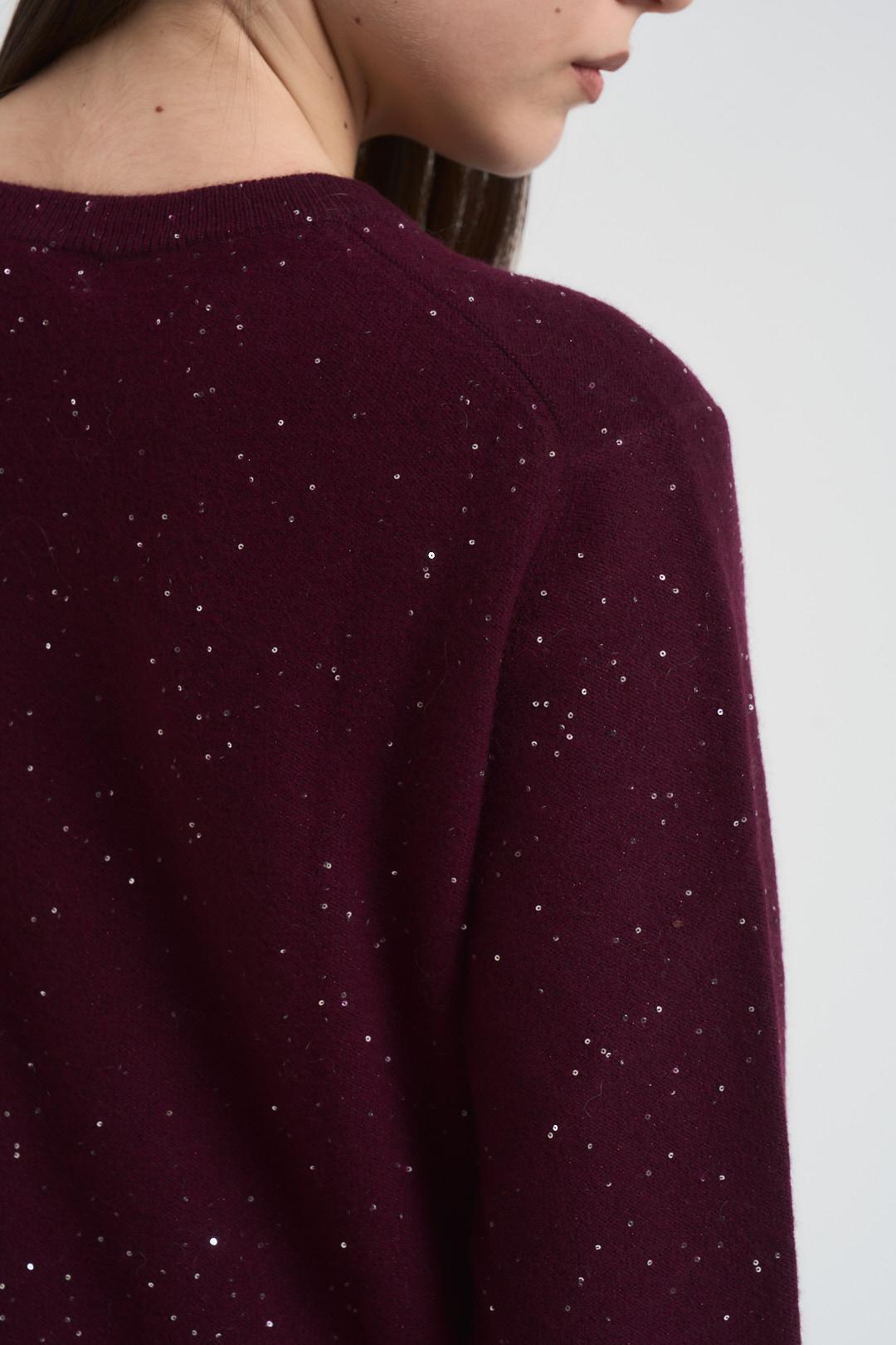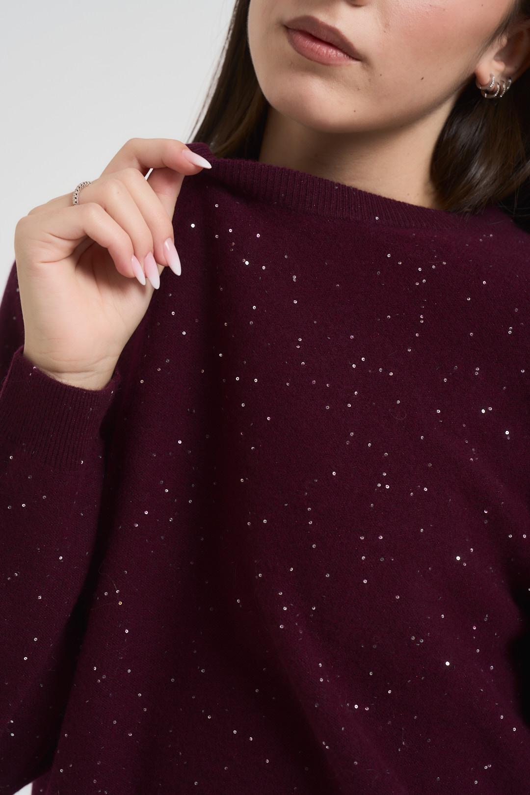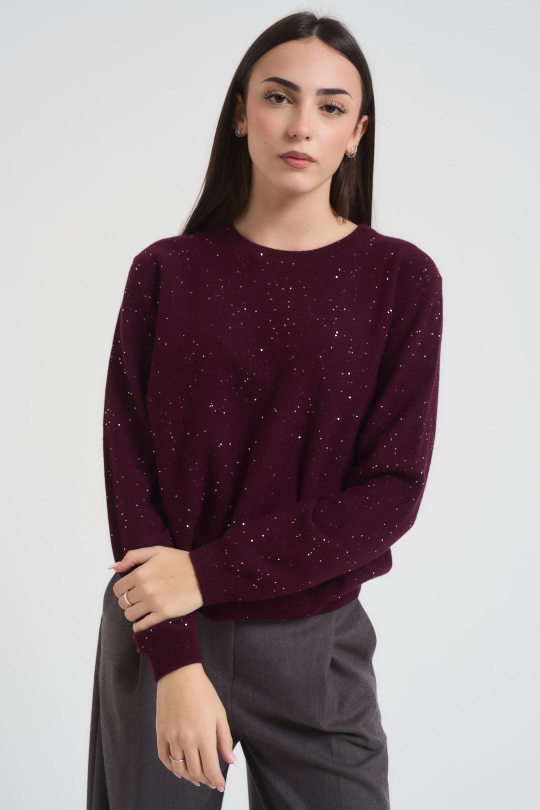 KIKISIX Maglia donna girocollo con strass bordeaux. Modello a manica lunga con dettagli a costine, regular fit. Composizione: 87% lana 8% lurex 5%cashmere. La modella è alta 172 cm e indossa la taglia unica.