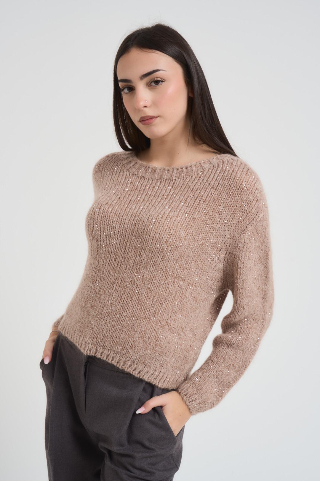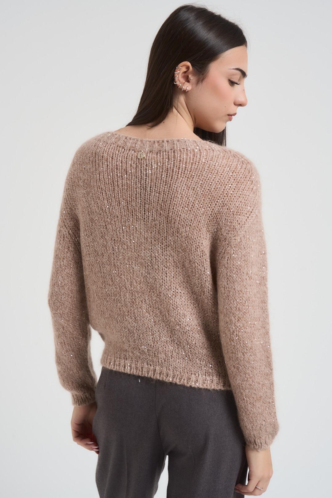 VITTO Maglia donna girocollo lurex beige. Modello manica lunga, regular fit, polsini a costine. Composizione: 39% polammide 25%acrilico 17% poliestere 16%mohair 3% lana. La modella è alta 172 cm e indossa la taglia S/M.