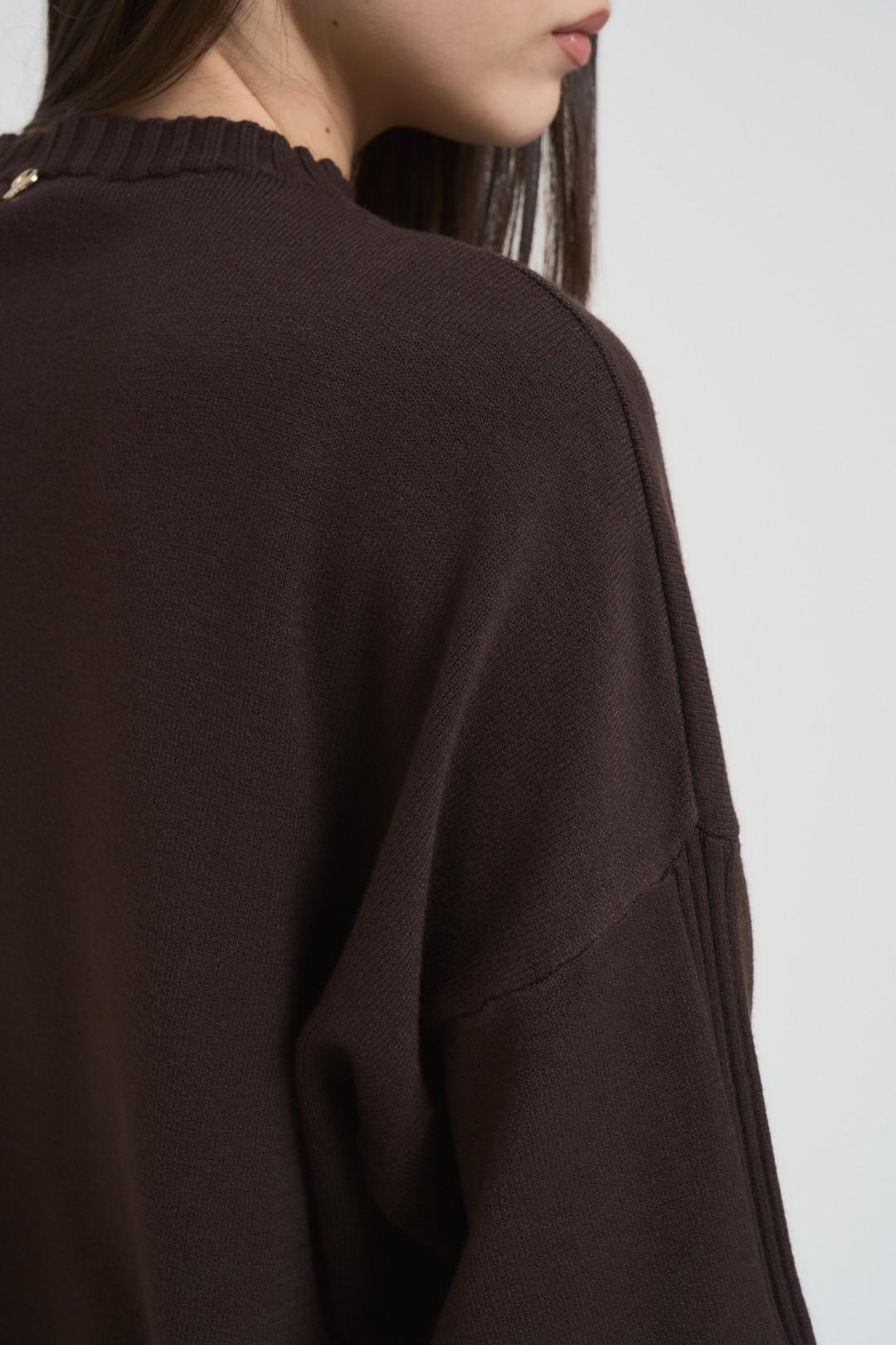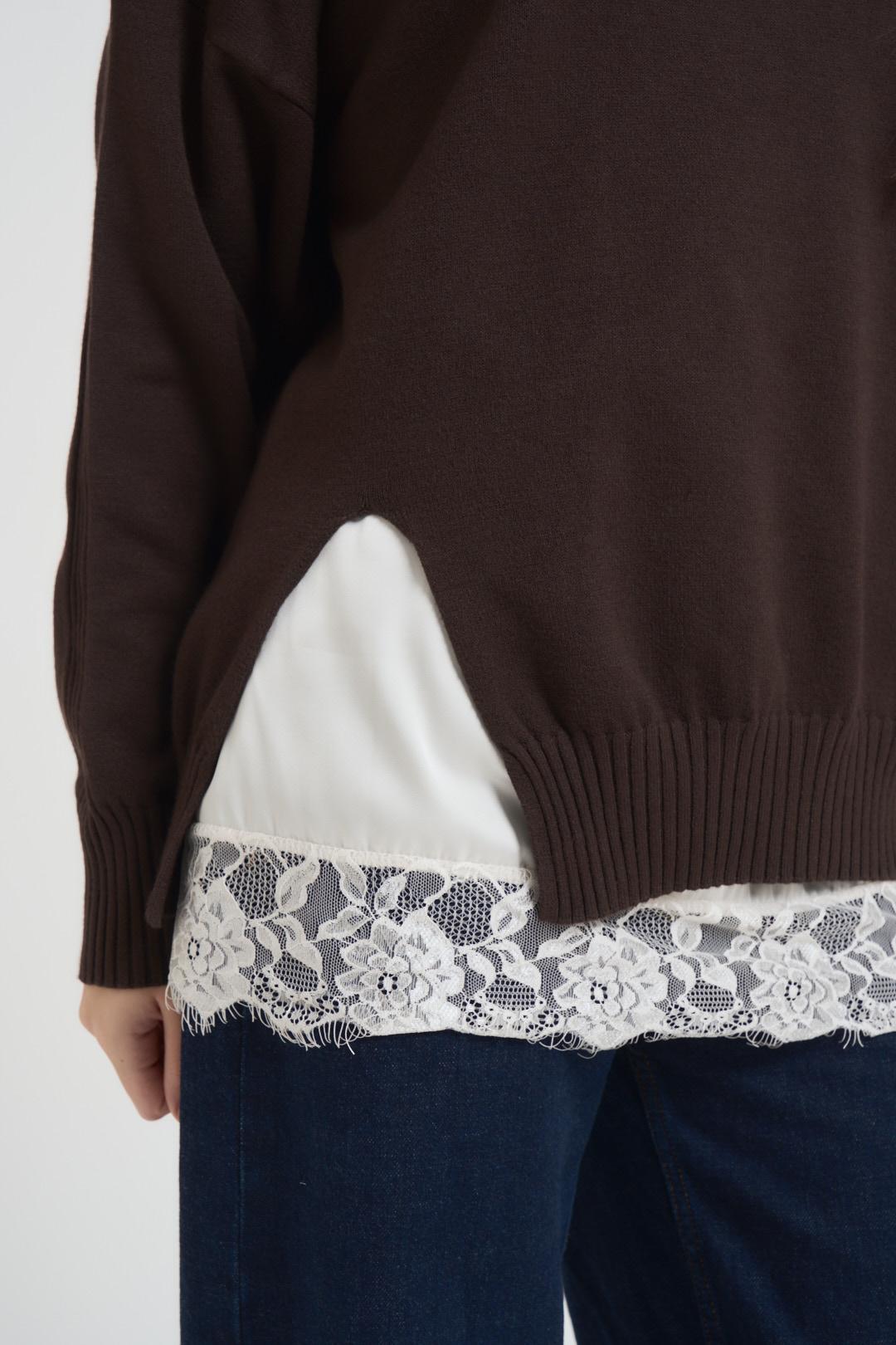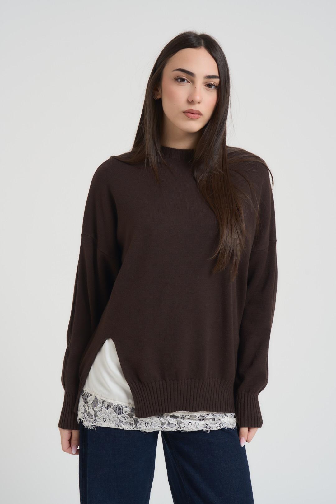 PHILIA Maglia donna girocollo marrone. Modello a manica lunga con dettaglio a costine e sottoveste bianca con pizzo. Composizione: viscosa e poliestere. La modella è alta 172 cm e indossa la taglia S.