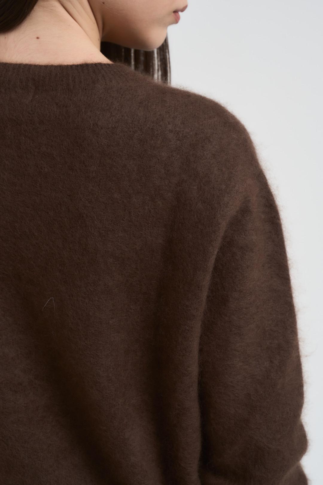 KIKISIX Maglia donna girocollo moro. Modello regular fit, manica lunga e orli a costine. Composizione: 89% lana 6%cashmere 5%seta. La modella è alta 172 cm e indossa la taglia UNI.