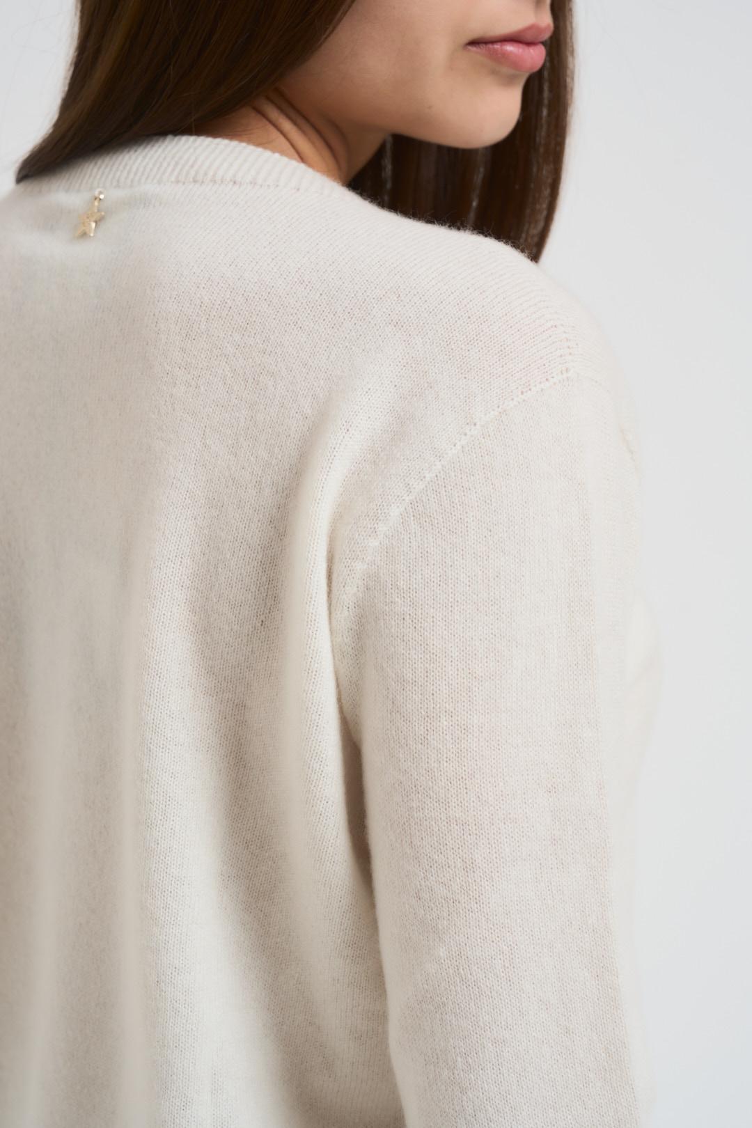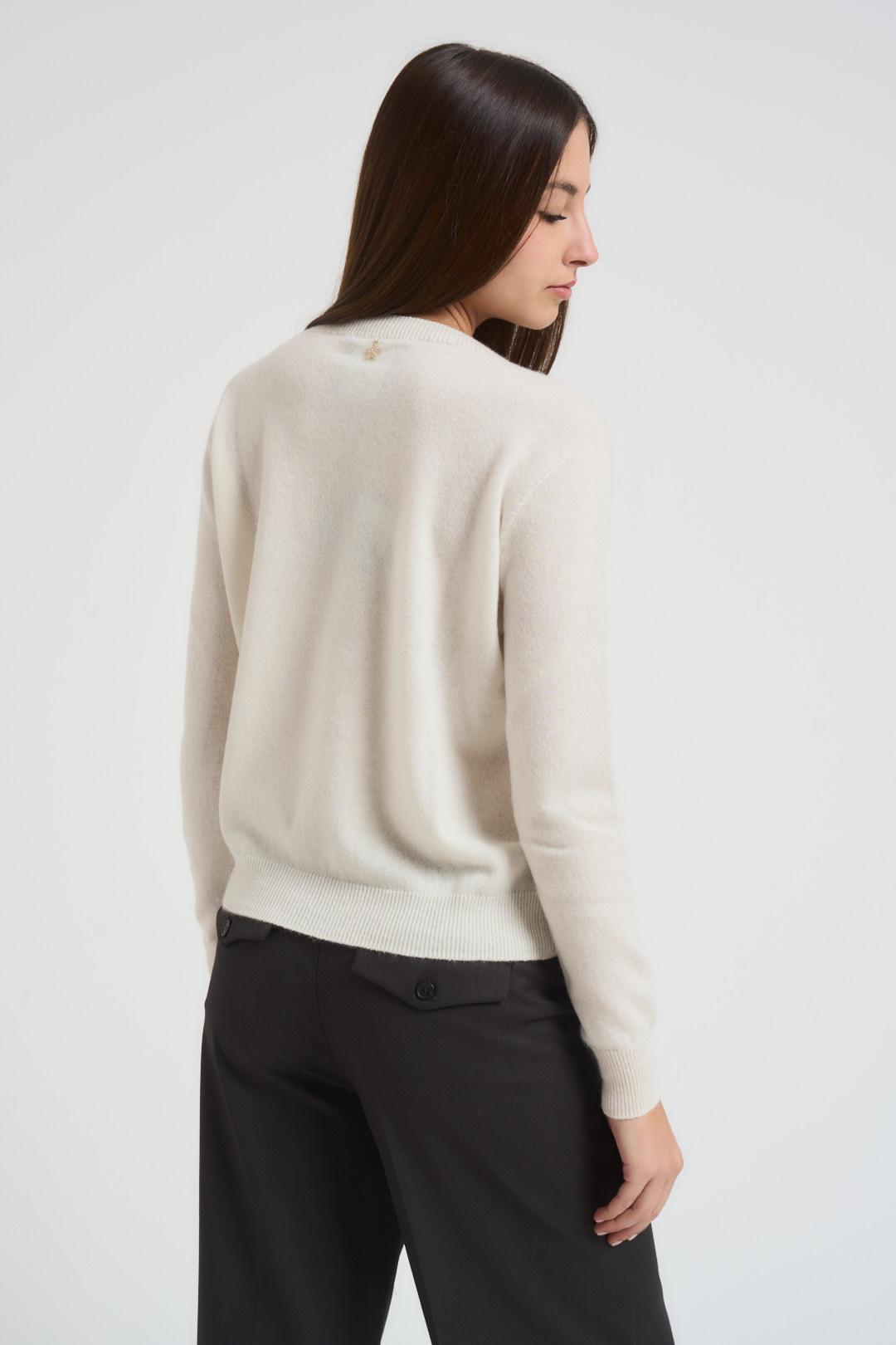 SOUVENIR CLUBBING Maglia donna girocollo panna. Modello regular fit. Collo, polsi e orlo a costine. Composizione: 100% cashmere. La modella è alta 172 cm e indossa la taglia S.