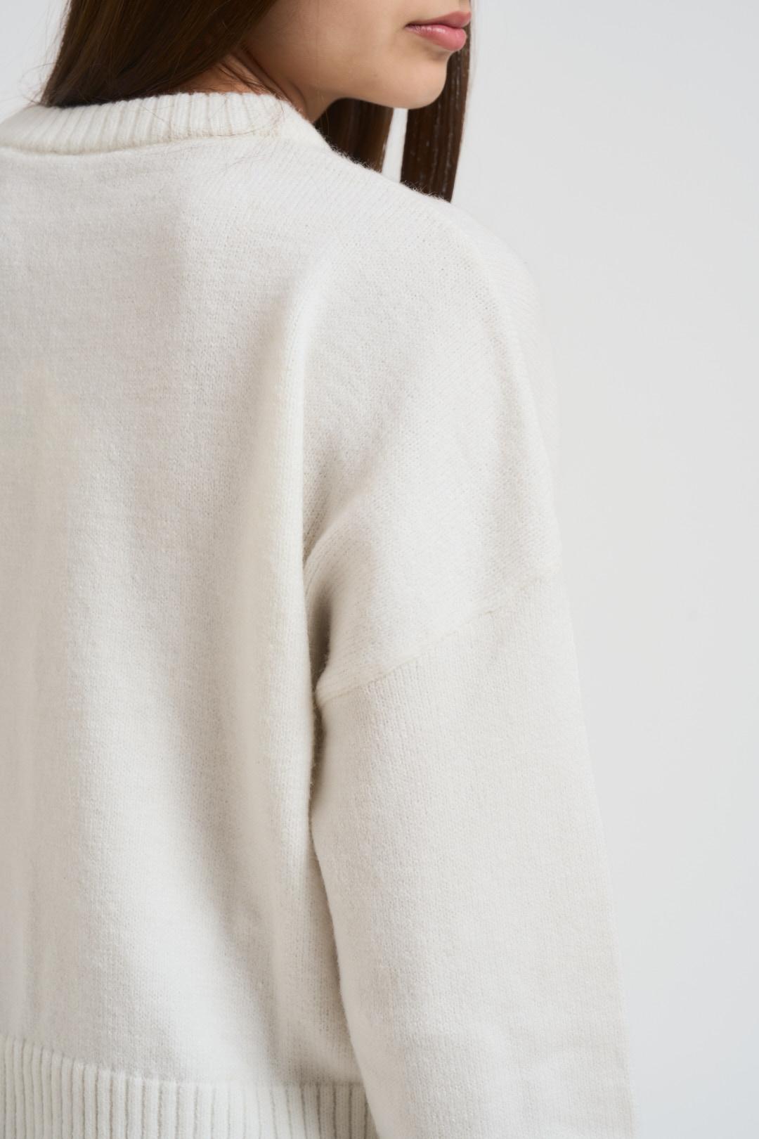 U.S. POLO Maglia donna girocollo panna. Modello over fit. Collo, fondo manica e orlo a coste. Manica lunga. Spacchi laterali sul fondo. Logo brand posto frontalmente sul petto. Composizione: 45% acrilico 29% poliestere 26% poliammide. La modella è alta 176 cm e indossa la taglia S.