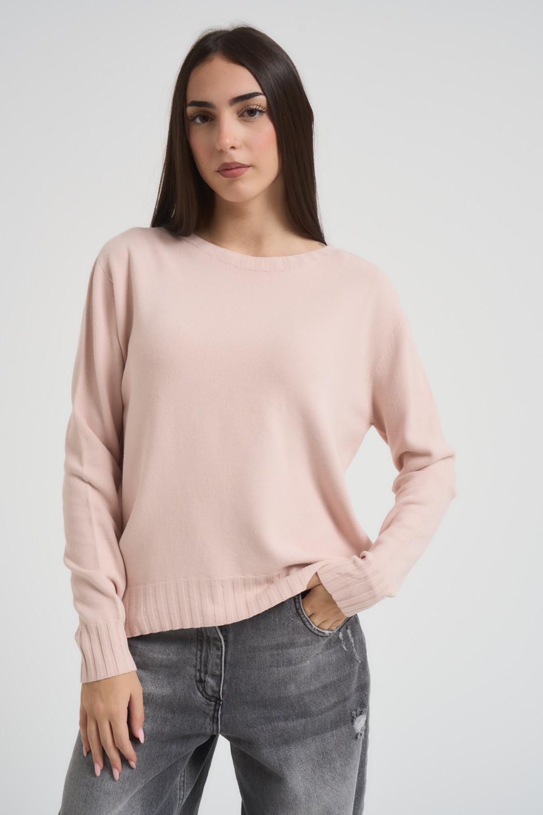 KONTATTO Maglia donna girocollo rosa cipria. Modello a manica lunga con dettaglio polsini e fondo a costine. Spacco sul retro. Composizione :63%viscosa 37% nylon. La modella è alta 172 cm e indossa la taglia unica.