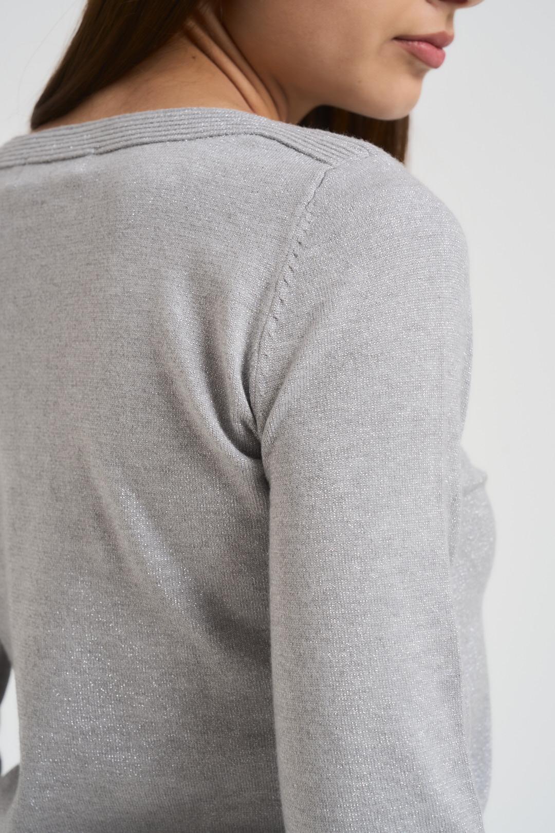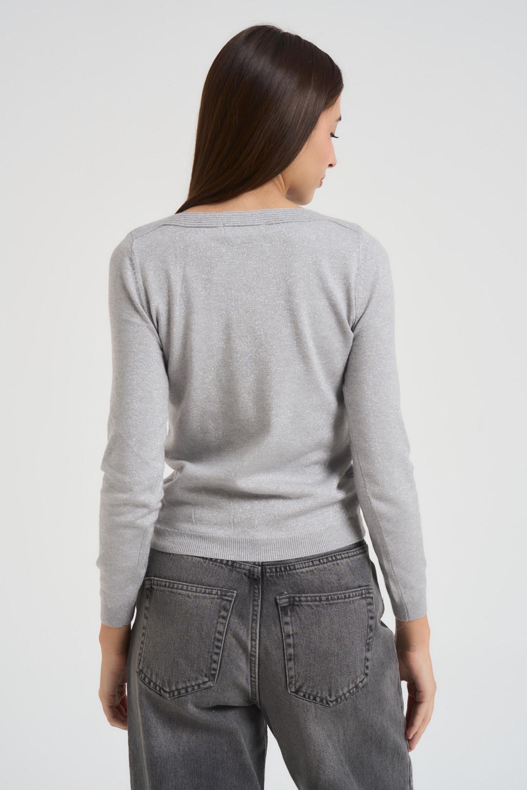 INCLOTH Maglia donna in lurex grigio chiaro. Modello con scollo a barca, manica lunga e dettagi a costine. Composizone: 100%Viscosa. La modella è alta 176cm e indossa la taglia S/M.