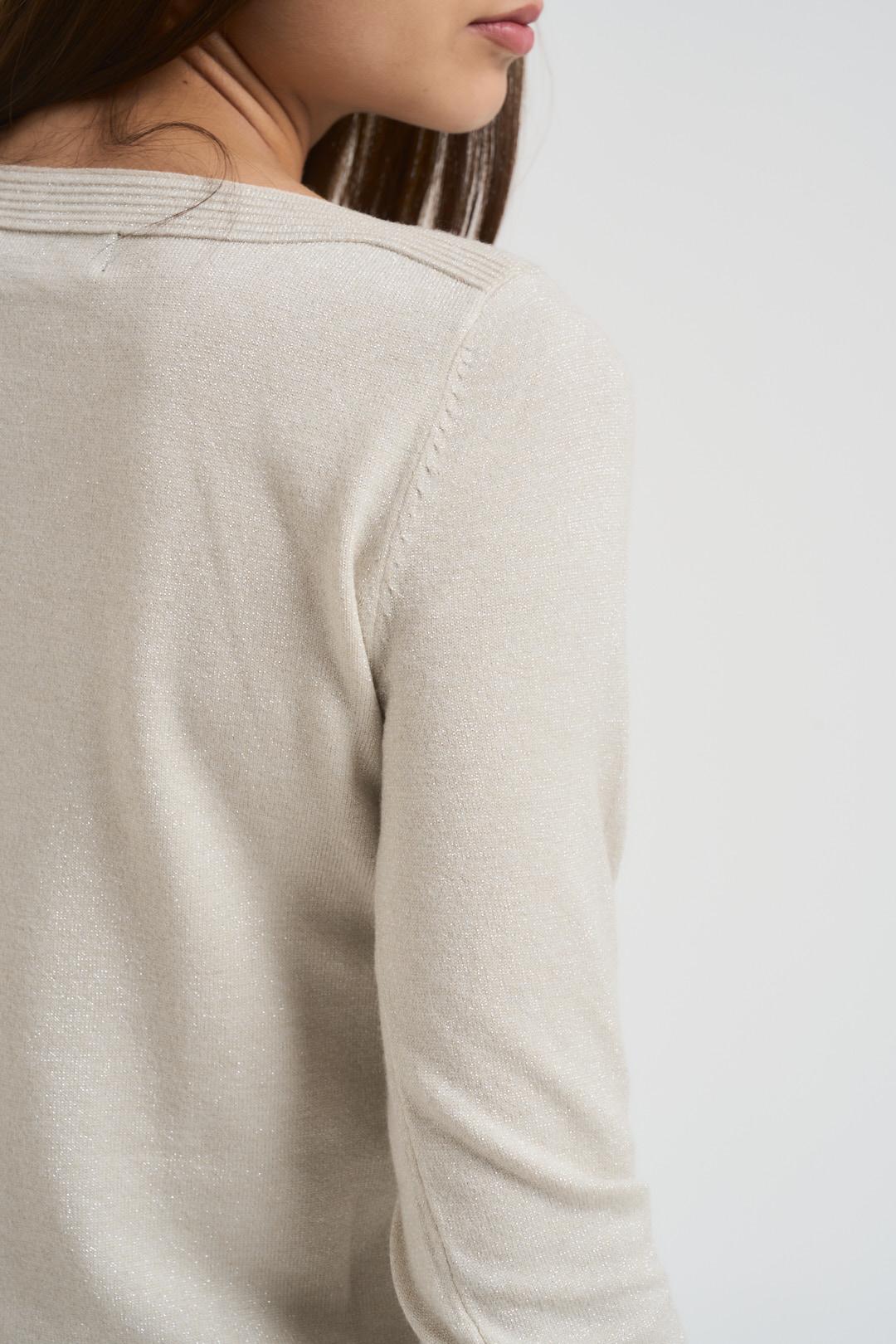 INCLOTH Maglia donna in lurex panna. Modello con scollo a barca, manica lunga e dettagi a costine. Composizone: 100%Viscosa. La modella è alta 176cm e indossa la taglia S/M.