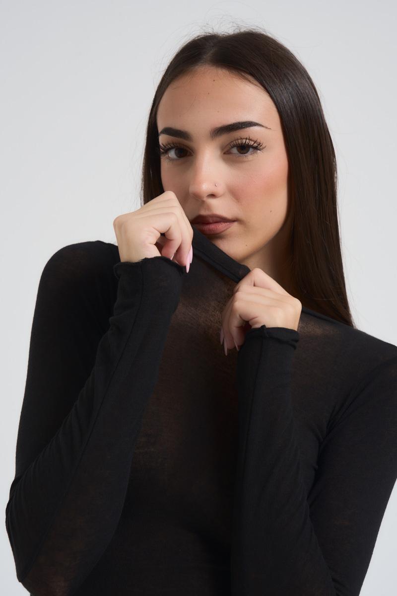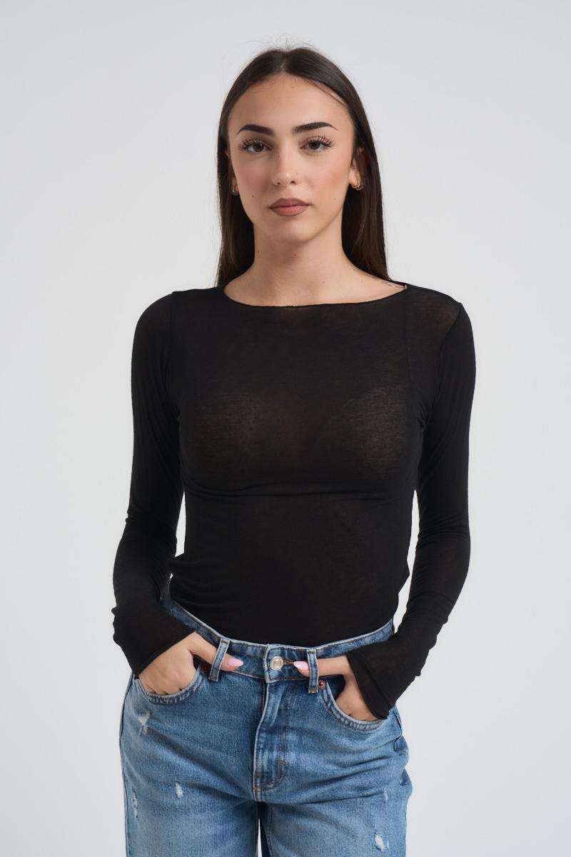 SOUVENIR CLUBBING Maglia donna nera scollo a barca. Manica lunga, effetto trasparente. Composizione: misto viscosa. La modella è alta 172 cm e indossa taglia unica.