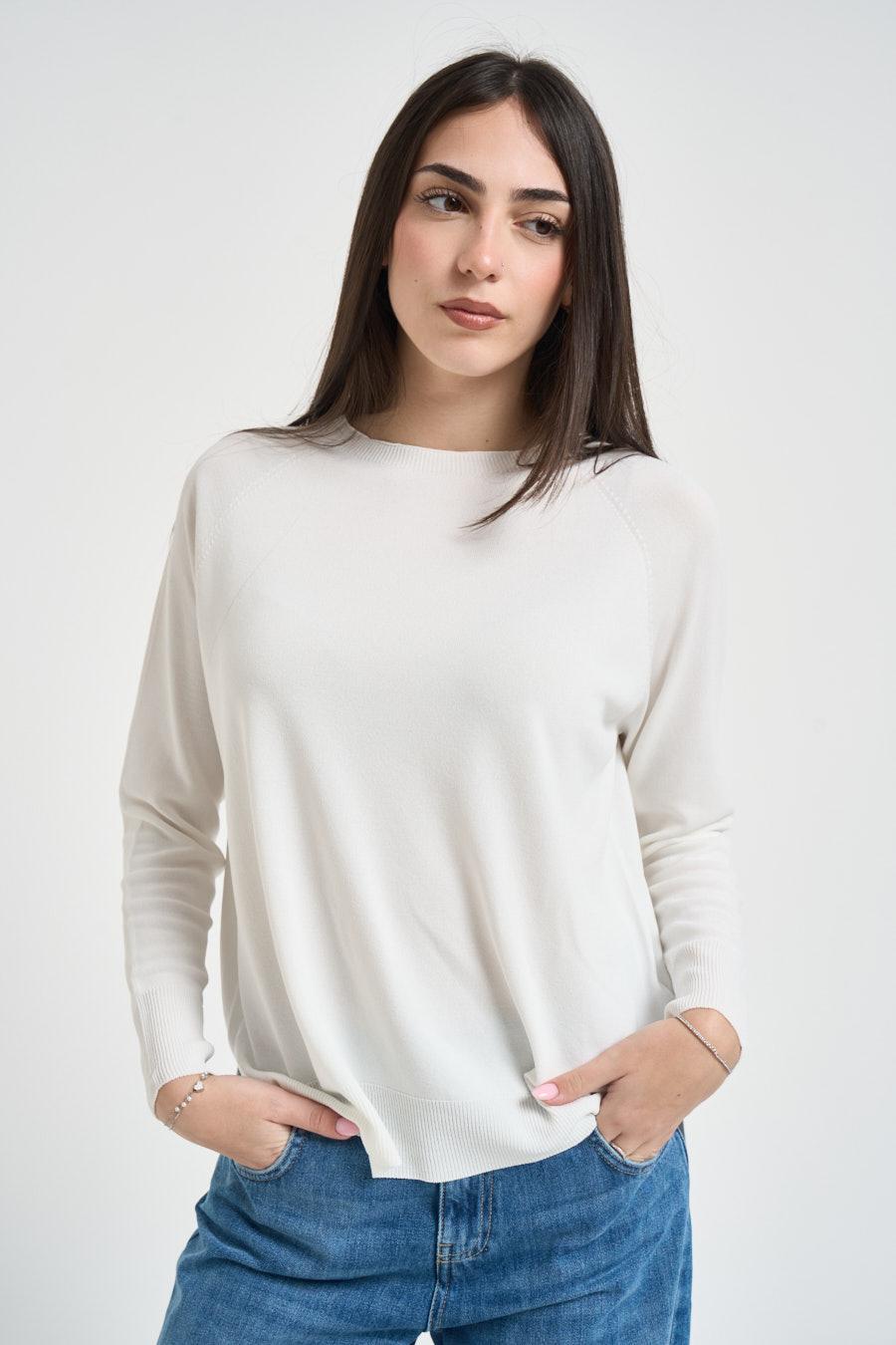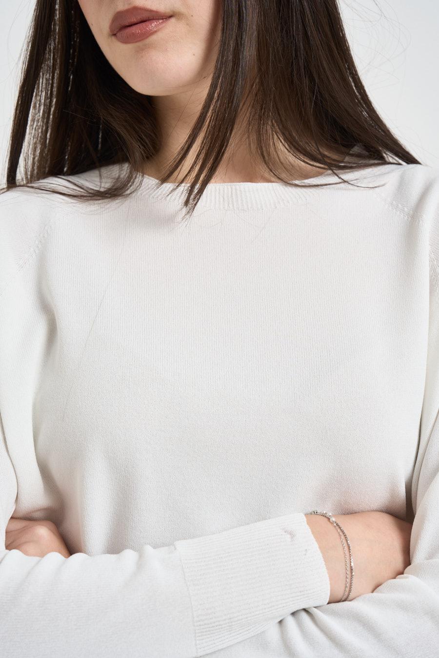 KAOS Maglia donna scollo a barca bianca. Modello regular fit. Manica lunga. Dettagli a costine. Manica lunga. Spacchetto laterale. Composizione: 65% viscosa, 35% poliammide. La modella è alta 172 cm e indossa la taglia S.