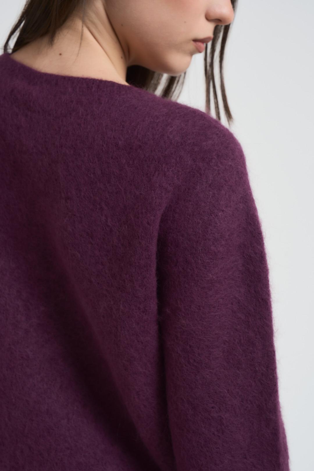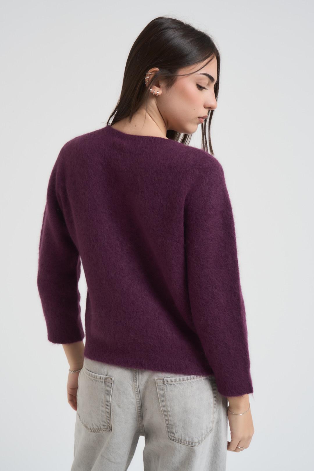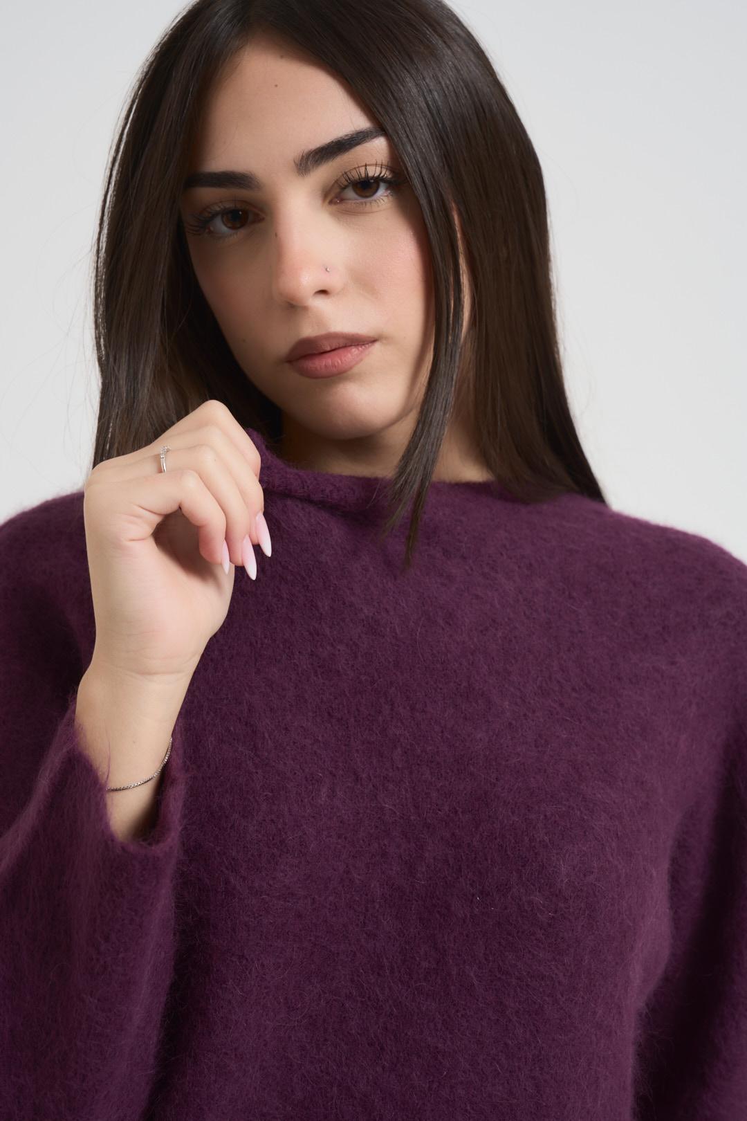 KONTATTO Maglia donna scollo a barca melanzana. Modello dalla vestibilità morbida. Manica a tre quarti. Composizione: 52% alpaca, 32% poliammide, 13% lana, 3%elastane. La modella è alta 172 cm e indossa la taglia UNI.
