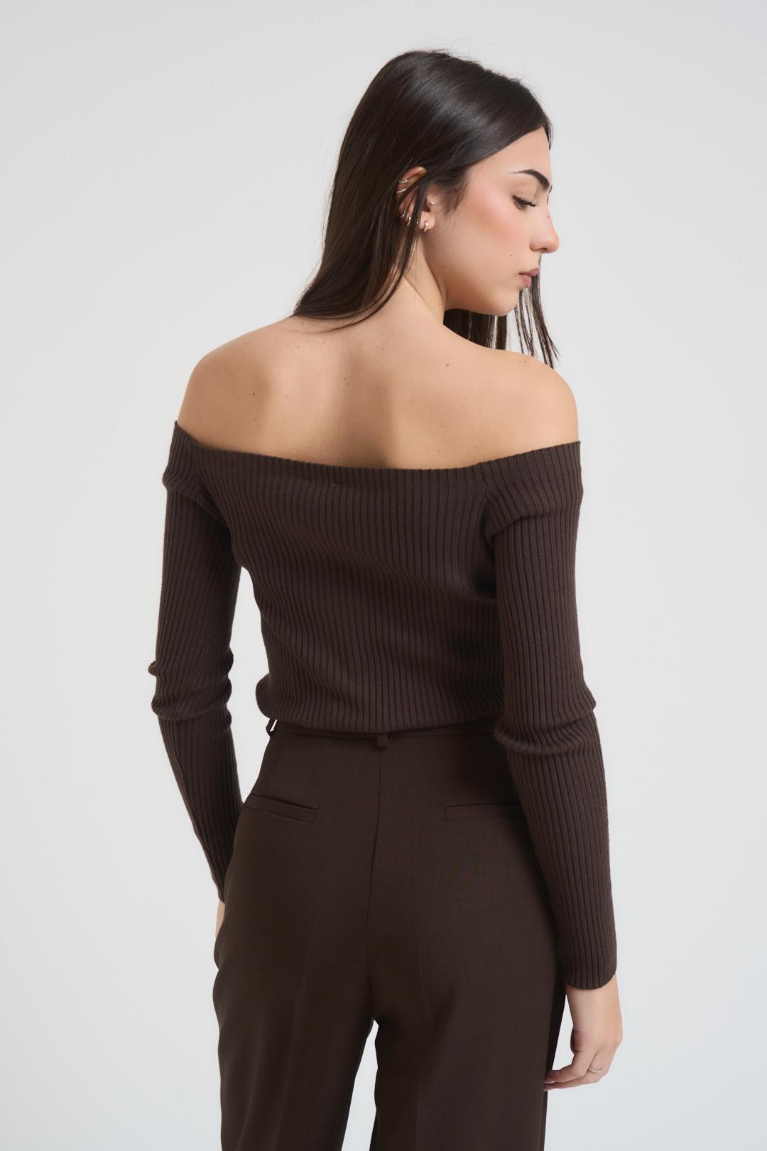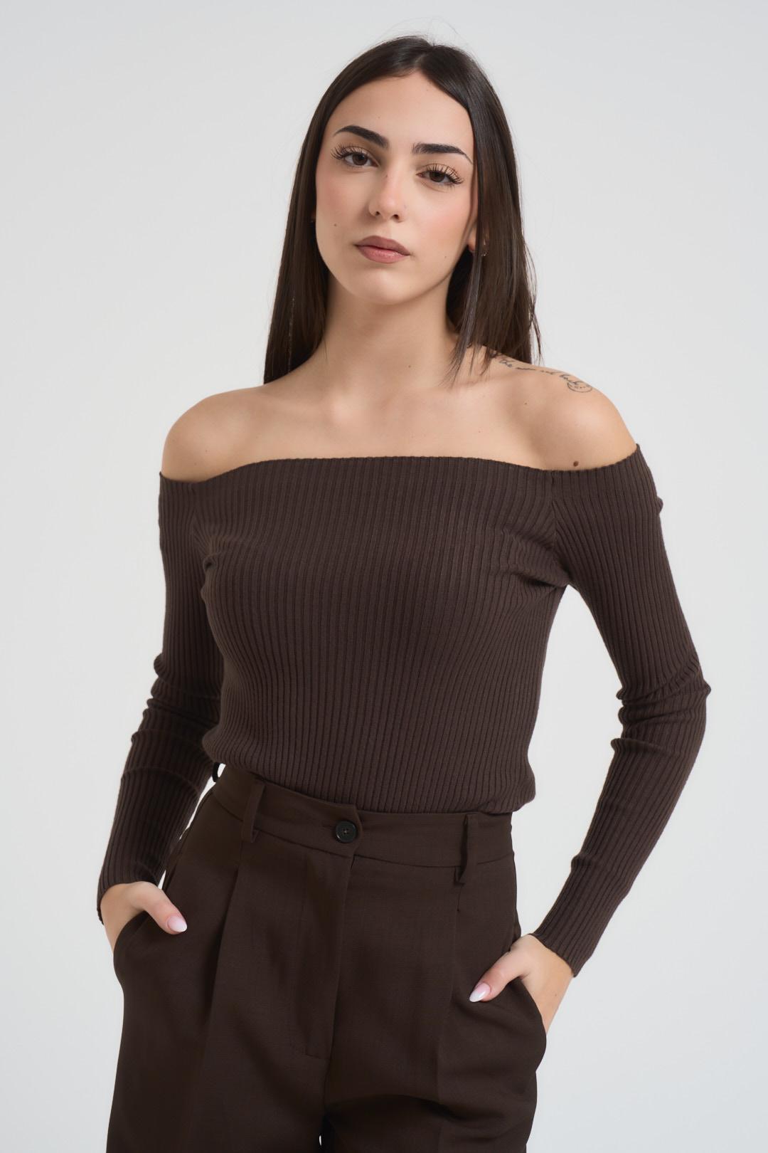 SUSY MIX Maglia donna scollo a barca moro. Modello a fascia con manica lunga. Tessuto a costine. Slim fit. Composizione: 55% viscosa 45% nylon. La modella è alta 172 cm e indossa la taglia UNI.