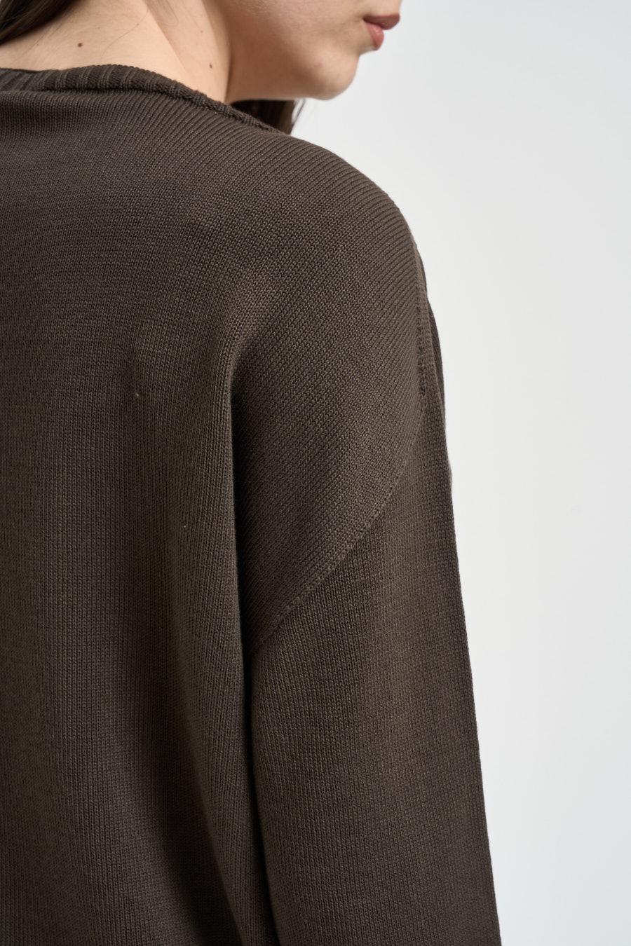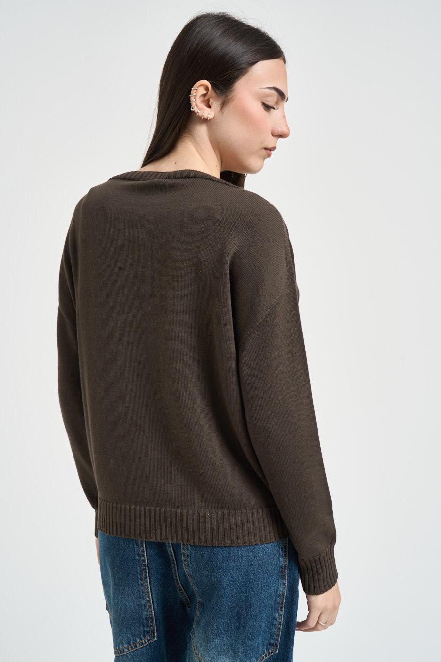 SUSY MIX Maglia donna scollo a barca moro. Modello dalla vestibilità morbida. Manica lunga. Giromanica sceso. Dettagli a costine. Composizione: 100% cotone. La modella è alta 172 cm e indossa la taglia UNI.