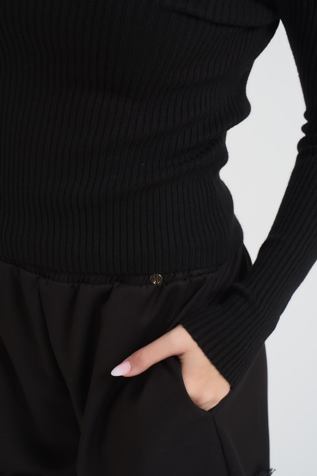 SUSY MIX Maglia donna scollo a barca nera. Modello a fascia con manica lunga. Tessuto a costine. Slim fit. Composizione: 55% viscosa 45% nylon. La modella è alta 172 cm e indossa la taglia UNI.