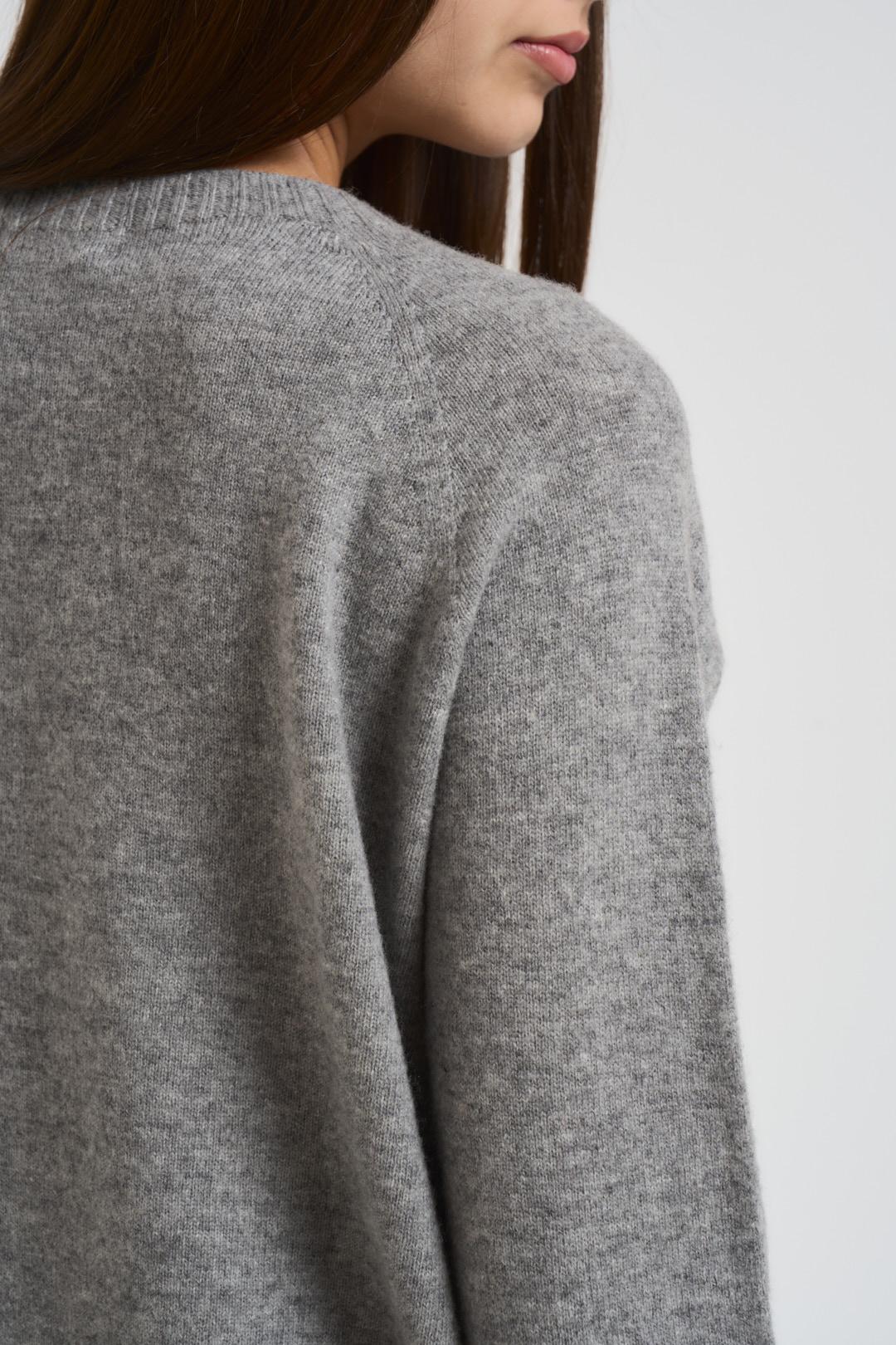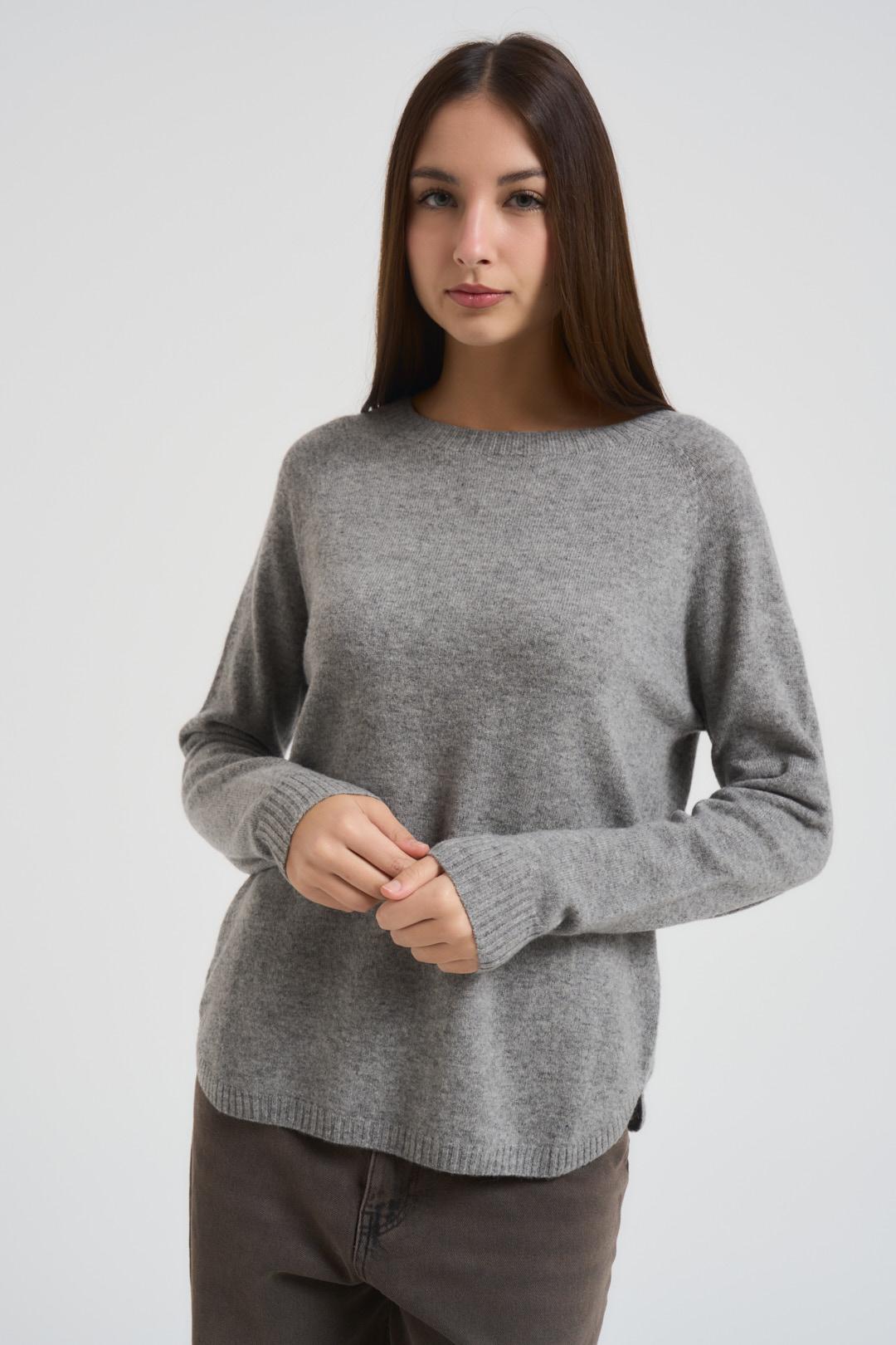 KIKISIX Maglia donna scollo a barchetta grigia. Modello con orlo, polsi e orlo a costine. Spacchetti laterali sul fondo. Manica lunga. Composizione: 90% Lana, 10% Cashmere. La modella è alta 176 cm e indossa la taglia UNI.