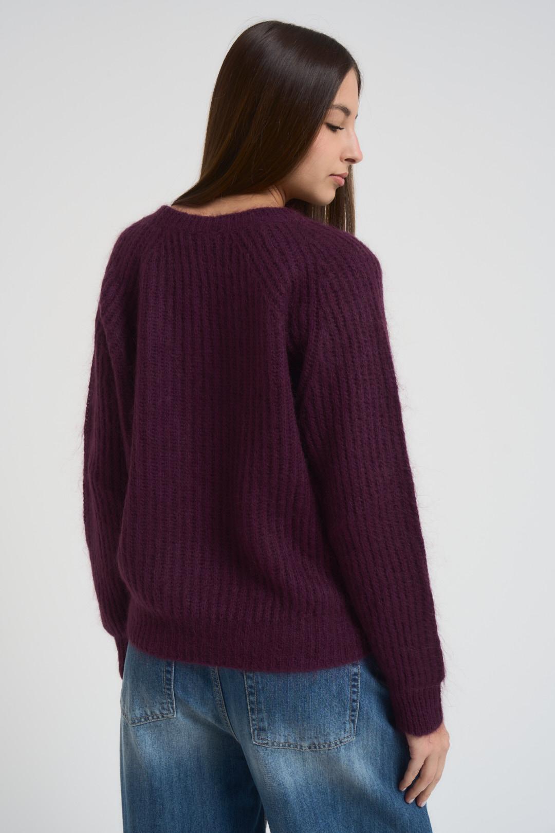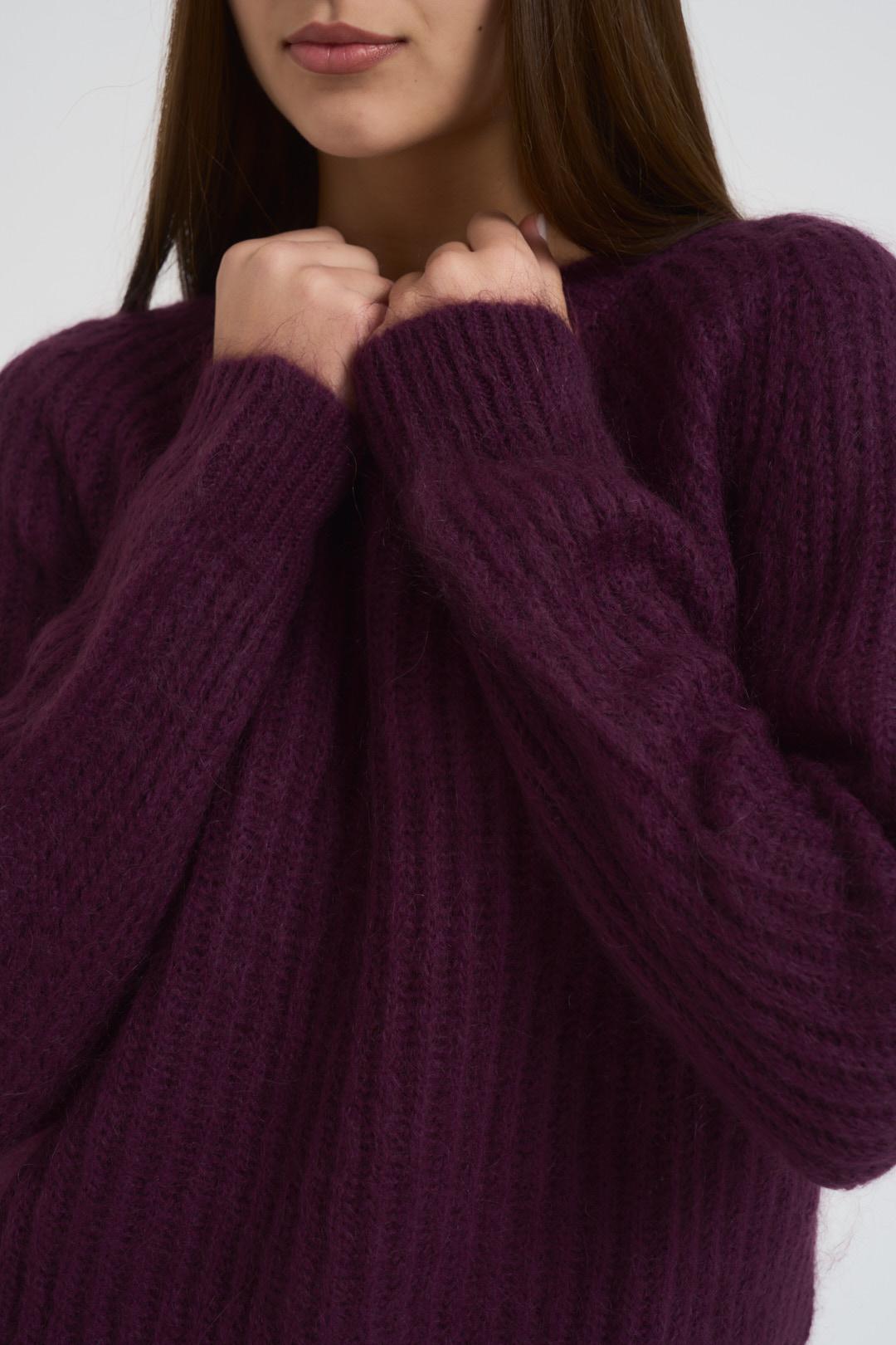 KONTATTO Maglia donna scollo a barchetta melanzana. Modello regular fit. Design a costine verticali. Manica lunga. Composizione: 36% Acrilico, 34% Lana, 30% Poliammide. La modella è alta 176 cm e indossa la taglia UNI.