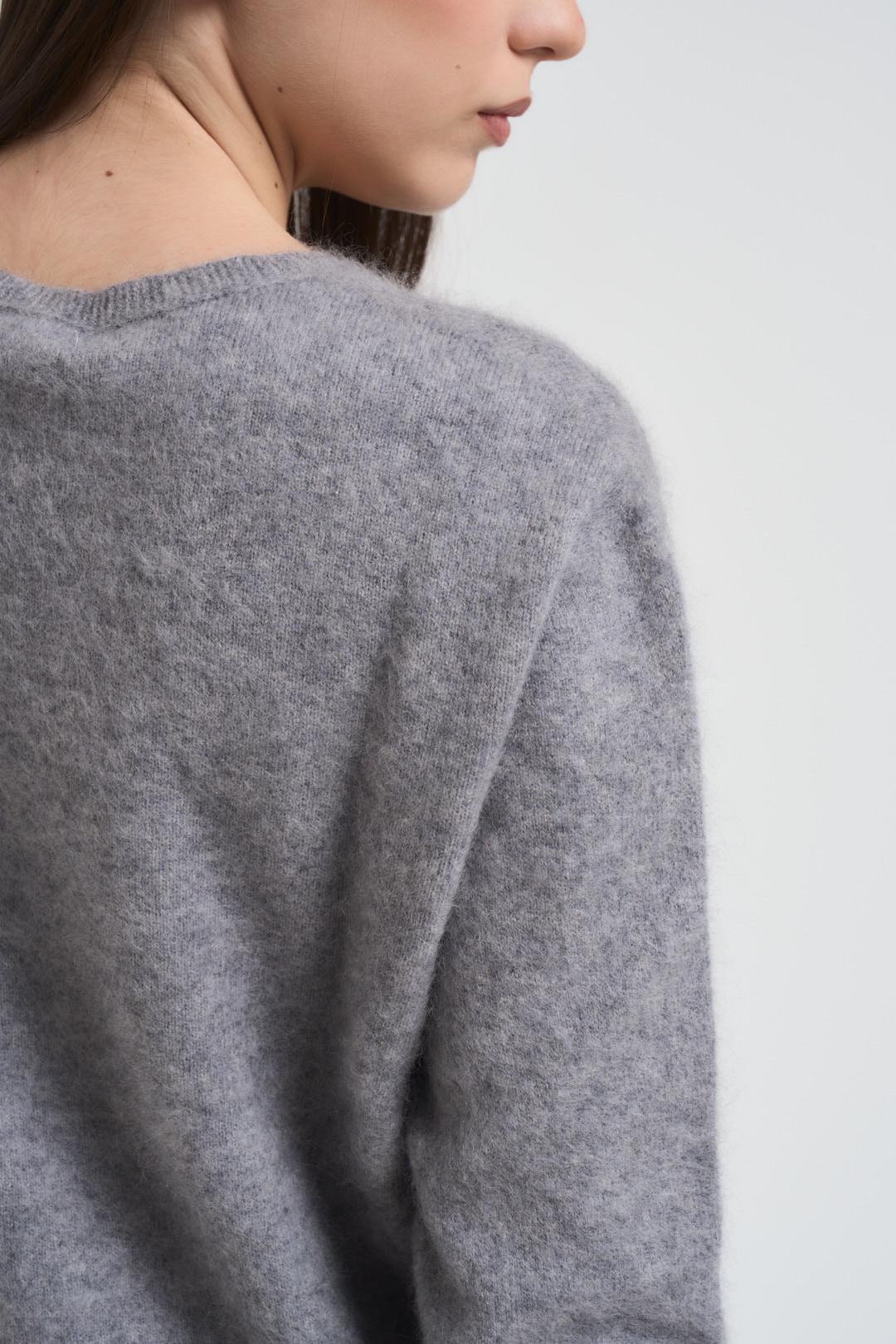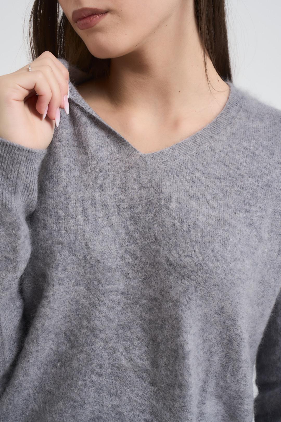 KIKISIX Maglia donna scollo a V grigio chiaro. Modello dalla vestibilità morbida. Maniche lunghe. Polsi e orlo a costine. Composizione: 89% lana, 6% cashmere, 5% seta di mulberry. La modella è alta 172 cm e indossa la taglia UNI.