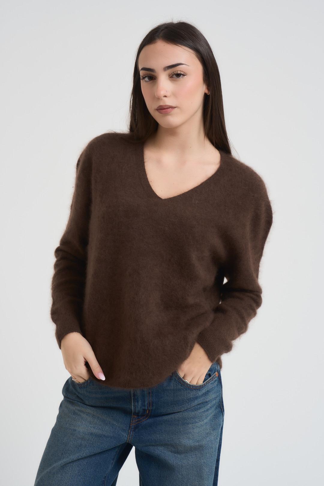 KIKISIX Maglia donna scollo a V moro. Modello dalla vestibilità morbida. Maniche lunghe. Polsi e orlo a costine. Composizione: 89% lana, 6% cashmere, 5% seta di mulberry. La modella è alta 172 cm e indossa la taglia UNI.