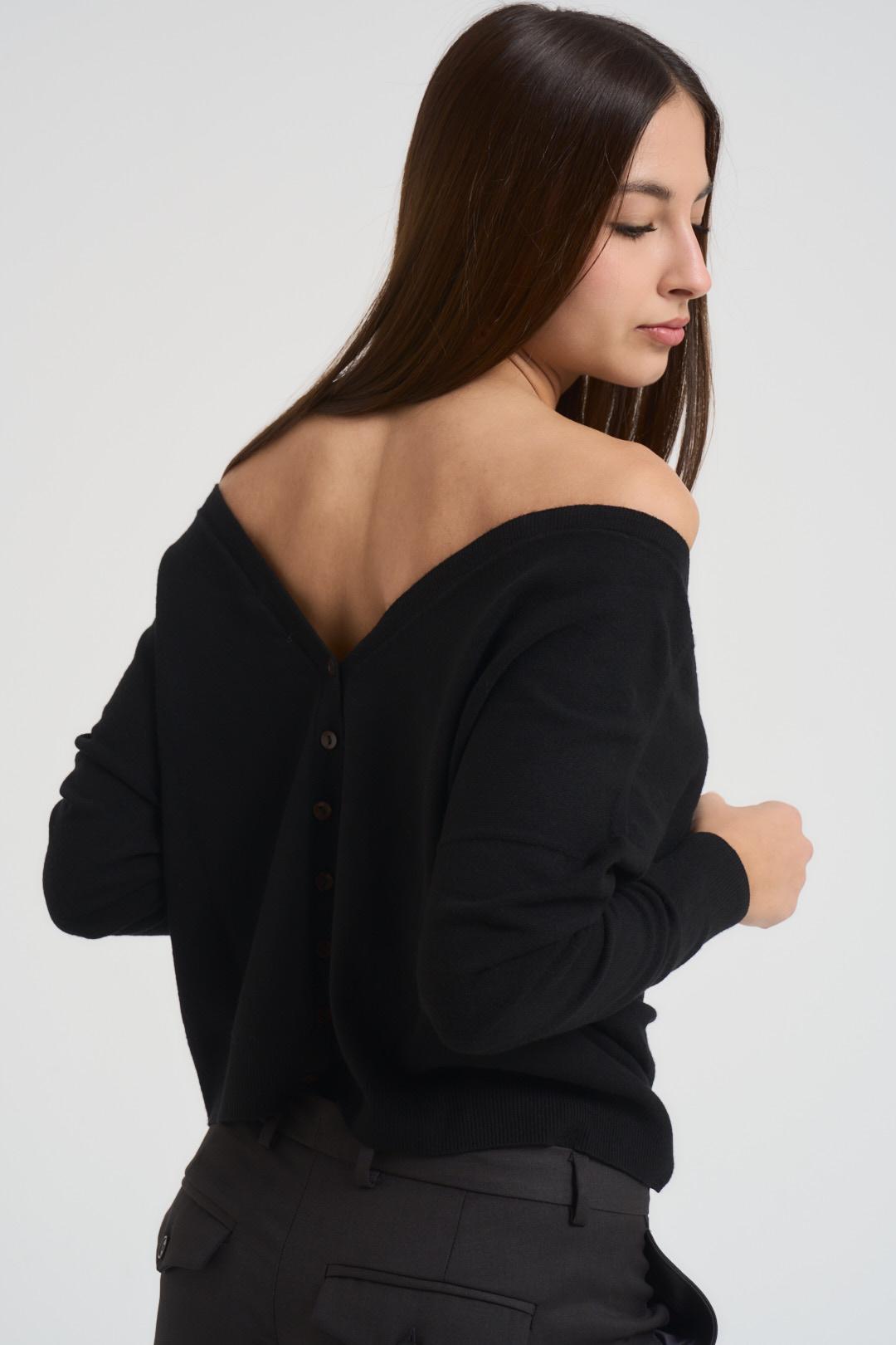 VITTO Maglia donna scollo a V nera. Modello con scollo profondo sul davanti, manica lunga e dettagli a costine. Composizione: 50% viscosa 27% poliestere 23% nylon. La modella è alta 176 cm e indossa la taglia S.