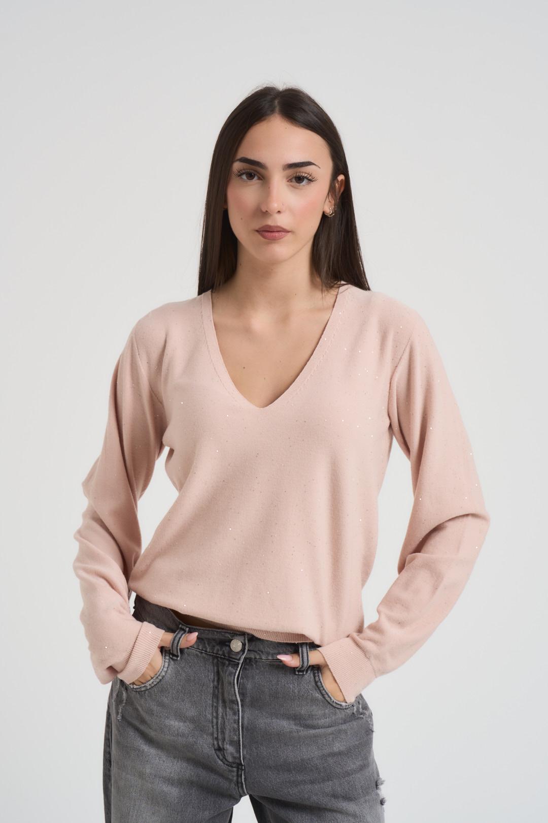 KONTATTO Maglia donna scollo a V rosa cipria. Modello con dettagli luminosi e polsini fndo manica. Composizione: 48% Viscosa 30% Poliestere 22% Poliammide. La modella è alta 172 cm e indossa la taglia S.