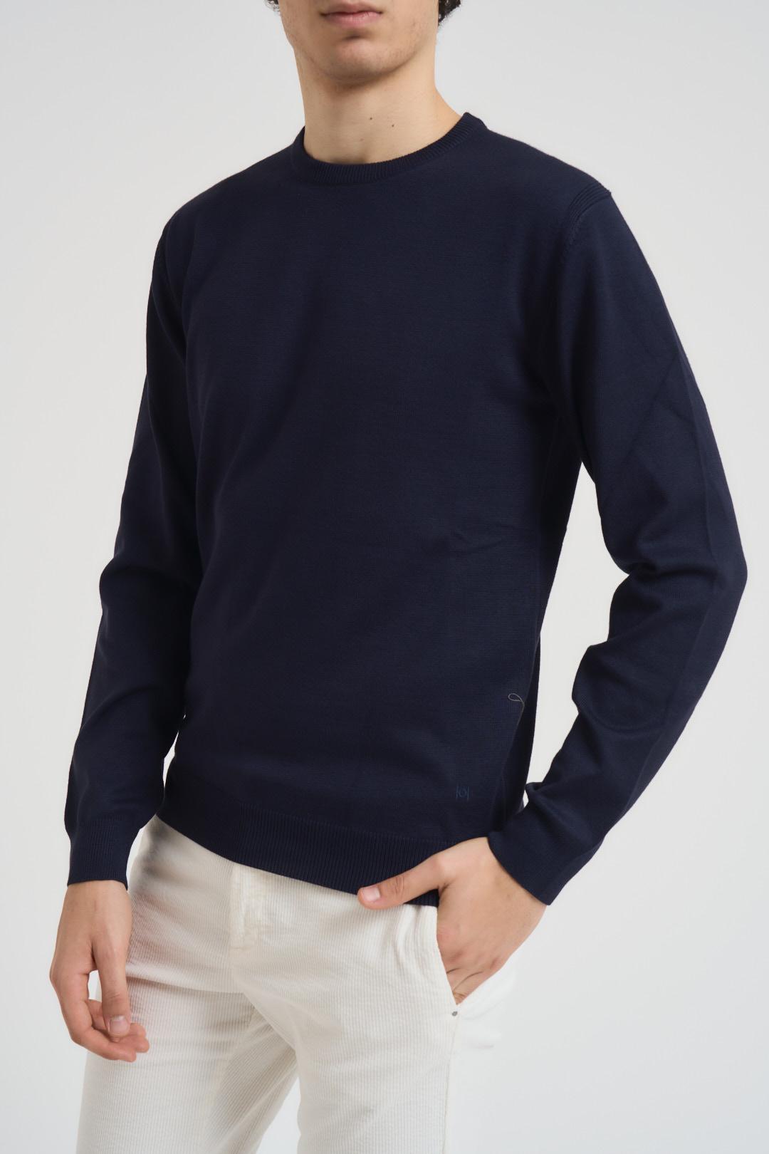 HAMAKI-HO MILANO Maglia uomo basic girocollo blu. Modello maniche lunghe. Polso e fondo a costine. Composizione: 70% viscosa 30% pl. Il modello è alto 185cm e indossa la tg L.
