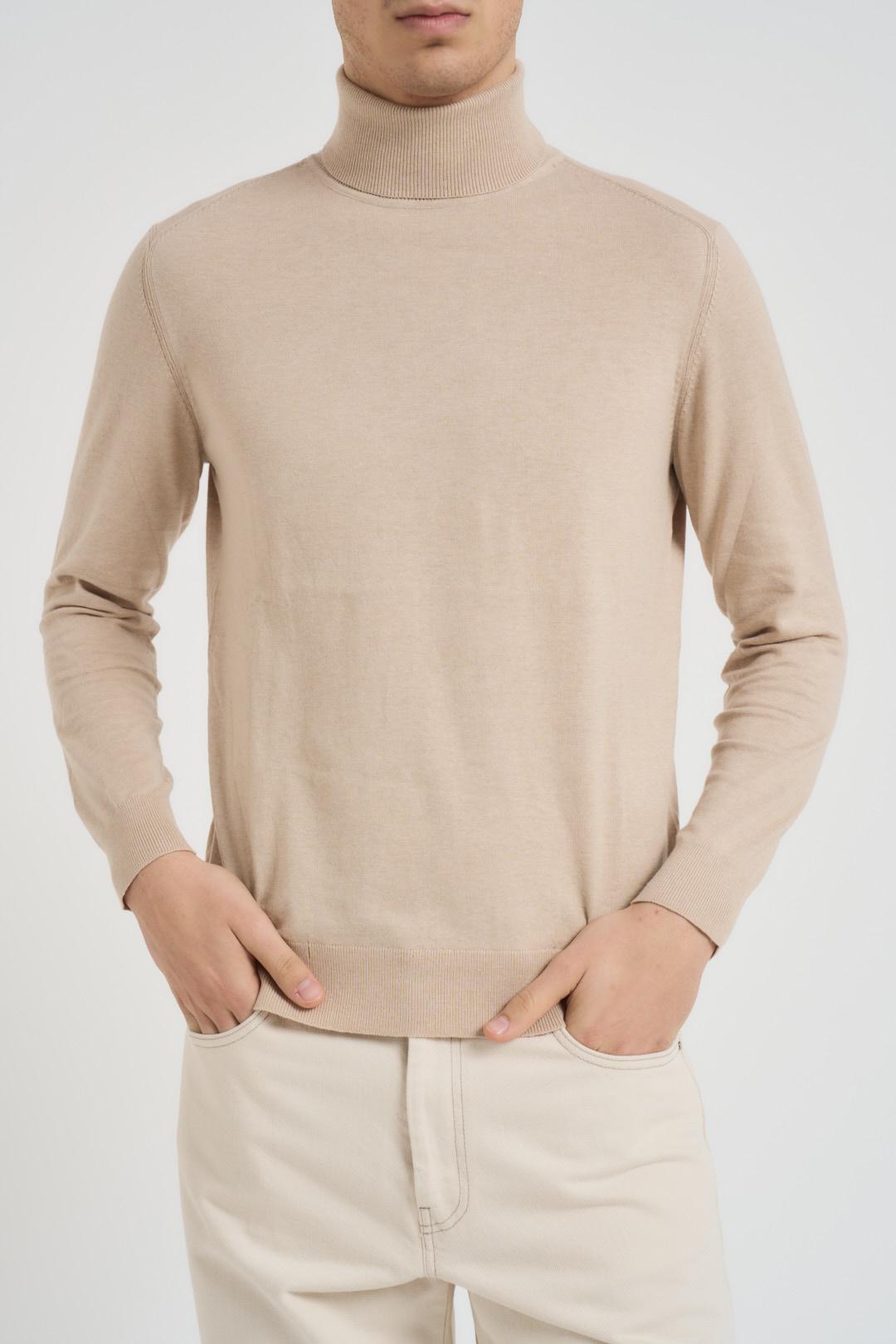 MARKUP Maglia uomo collo alto beige. Modello regular fit. Manica lunga. Collo, polsi e orlo a costine. Composizione: 60% cotone, 30% seta, 10% cashmere. Il modello è alto 190 cm e indossa la taglia L.