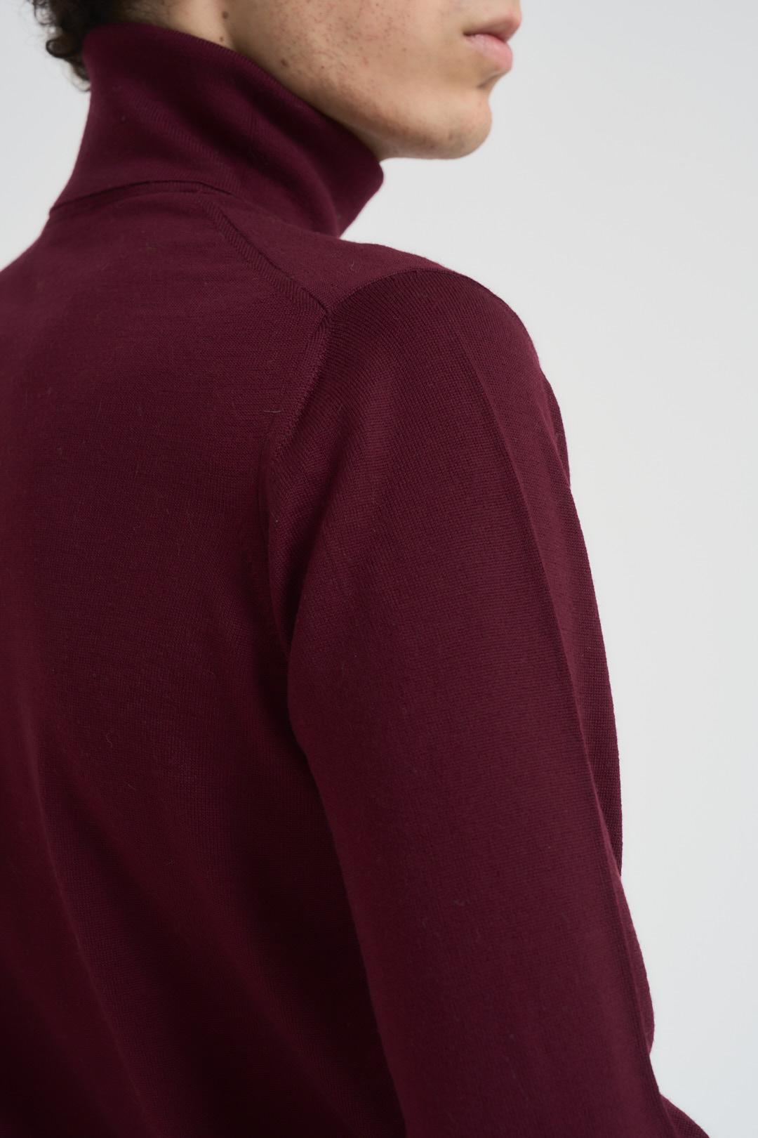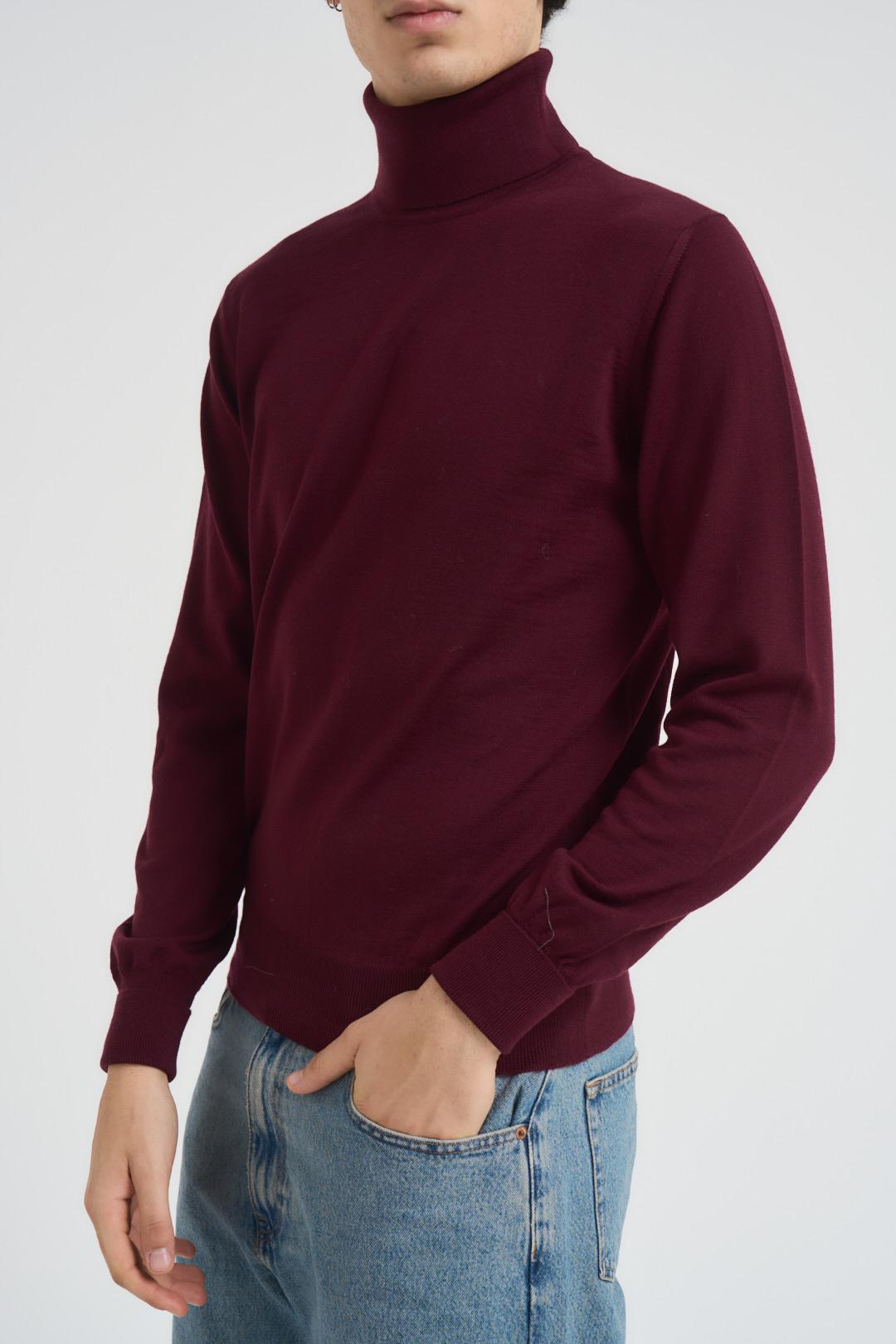 ALPHA STUDIO Maglia uomo collo alto bordeaux. Modello con toppe sui gomiti. Composizione: 100% Lana. Il modello è alto 190 cm e indossa la taglia 50.