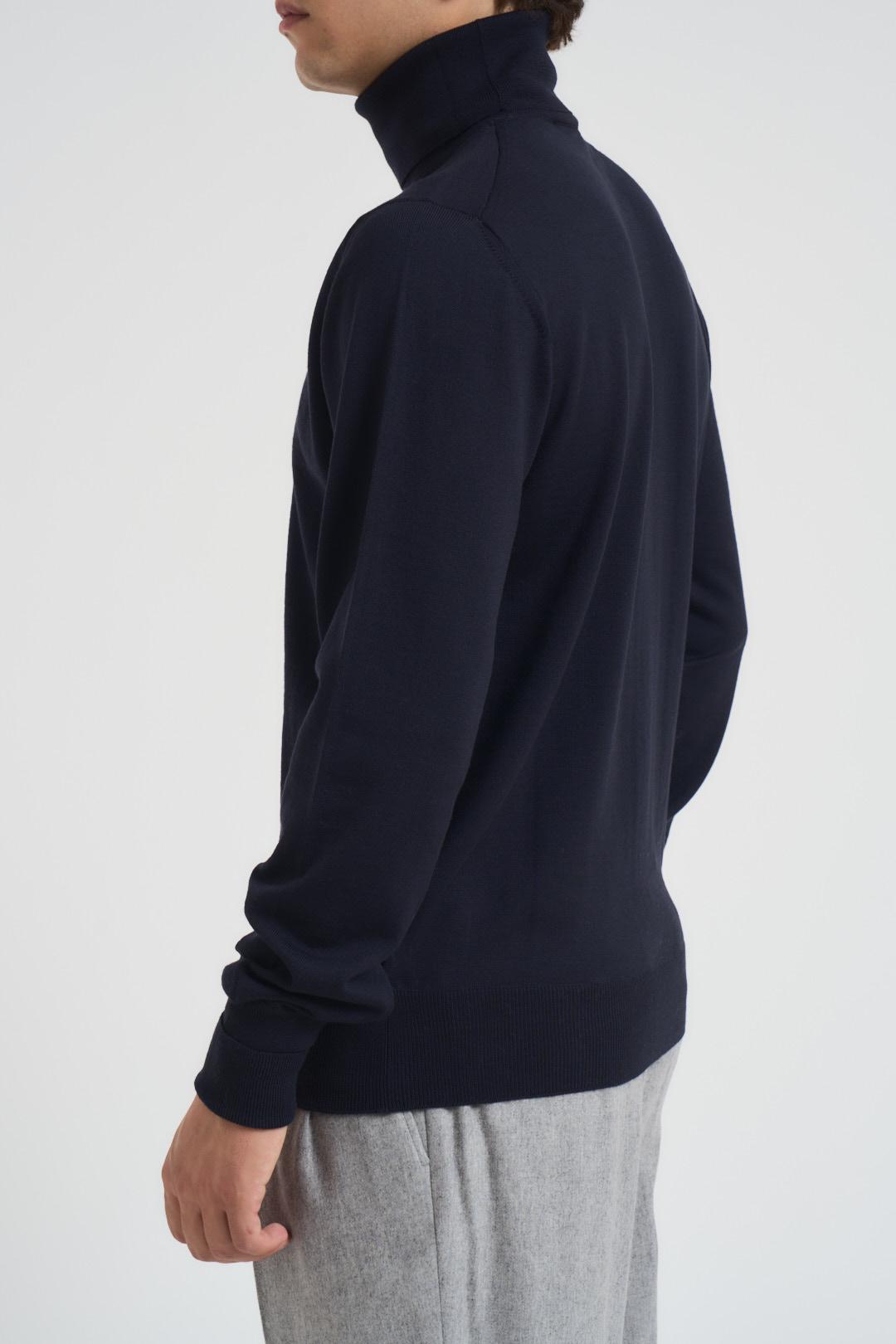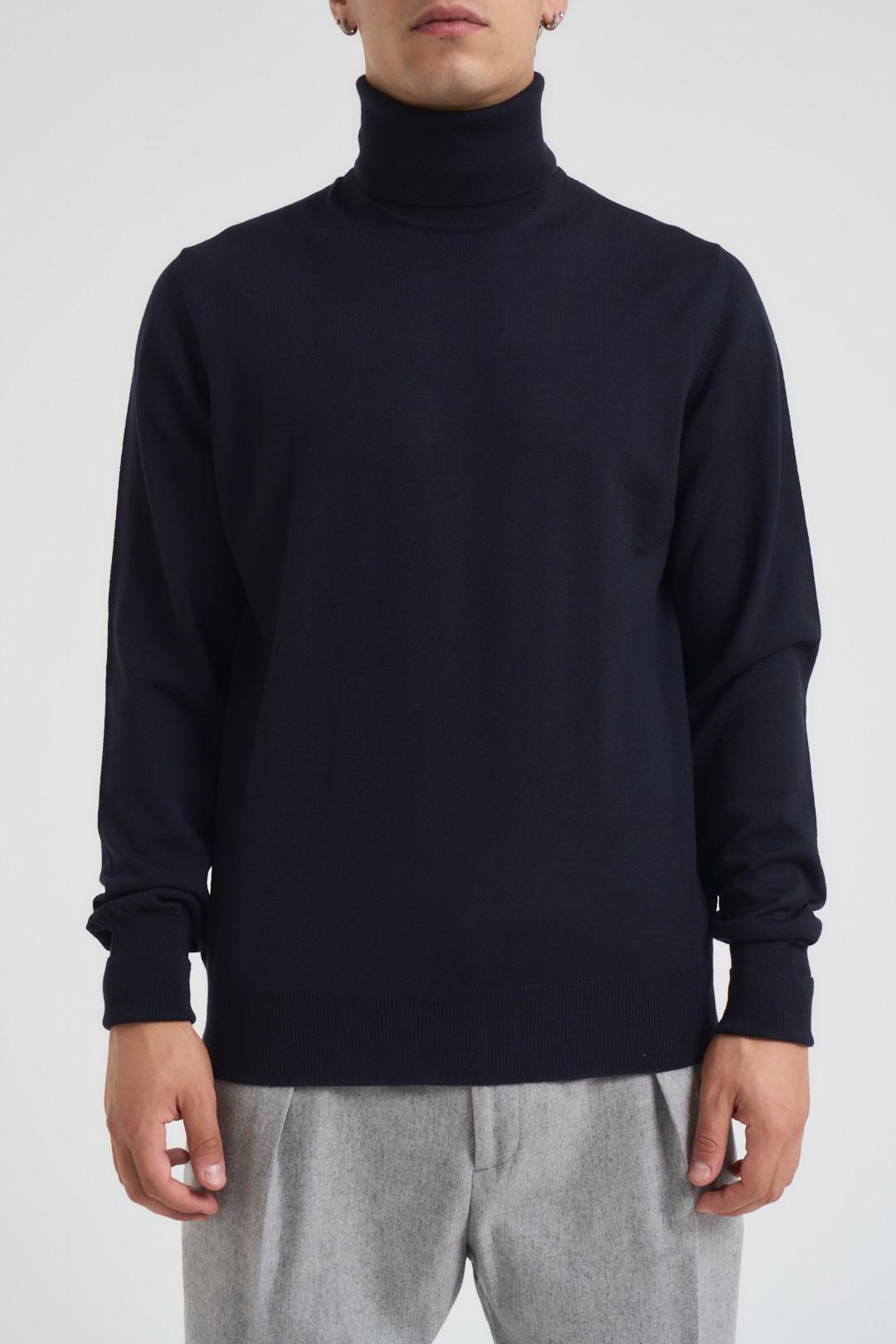 ALPHA STUDIO Maglia uomo collo alto blu. Modello con toppe sui gomiti. Composizione: 100% Lana. Il modello è alto 190 cm e indossa la taglia 50.