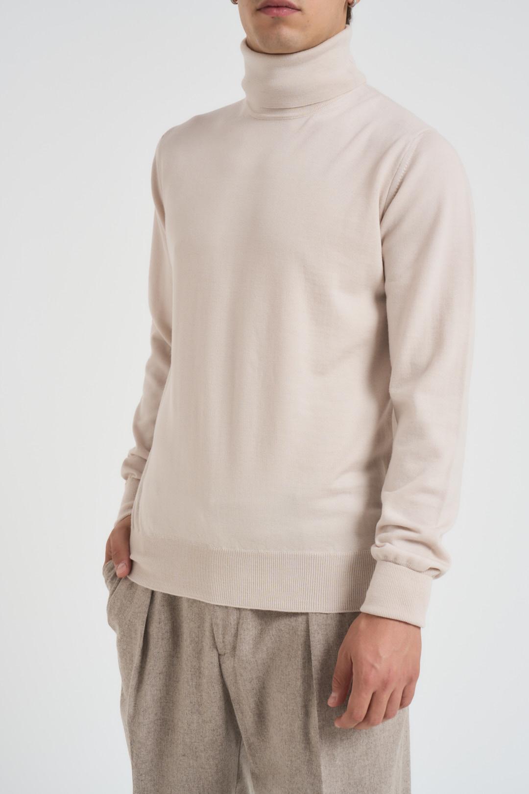ALPHA STUDIO Maglia uomo collo alto stucco. Modello con toppe sui gomiti. Composizione: 100% Lana. Il modello è alto 190 cm e indossa la taglia 50.