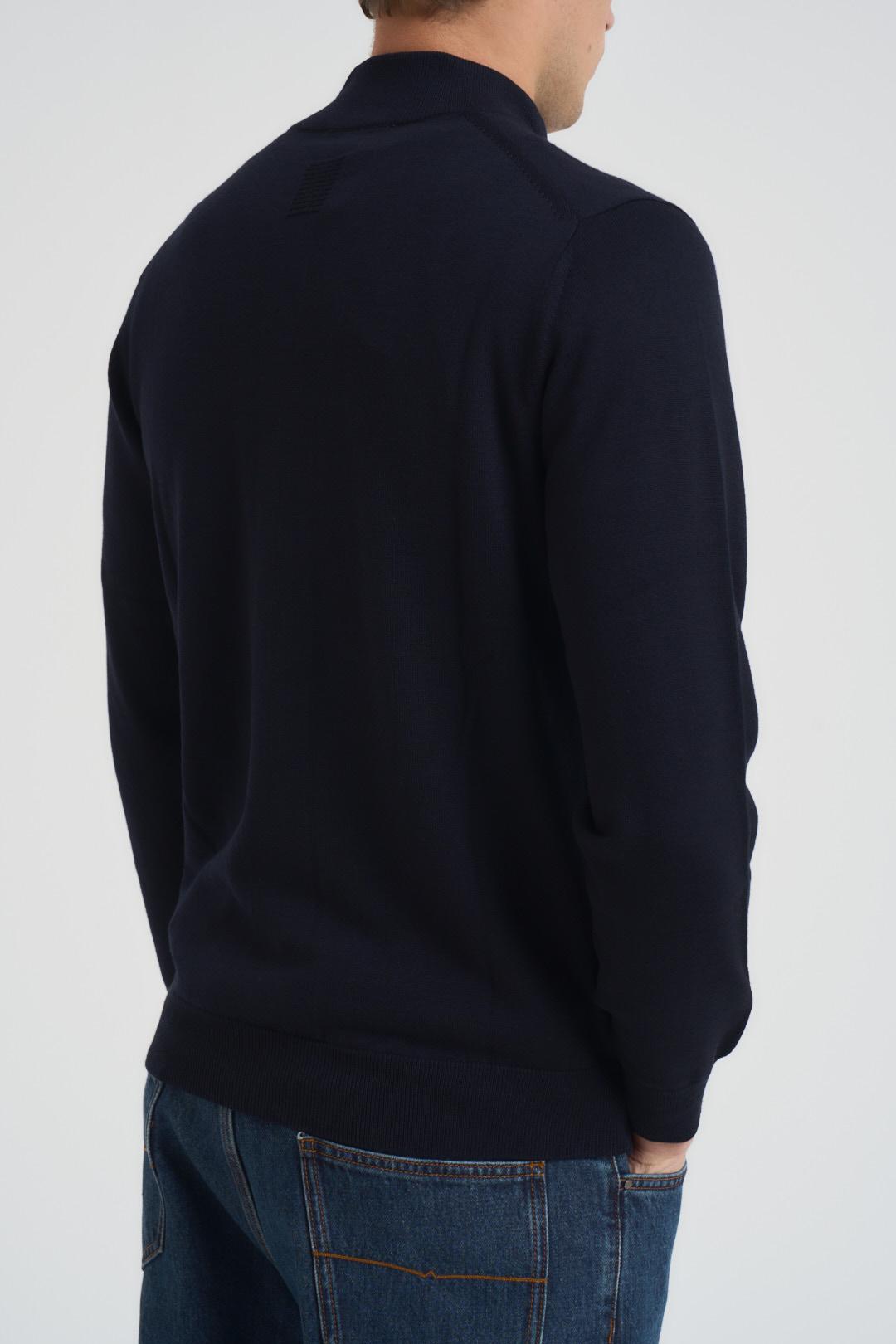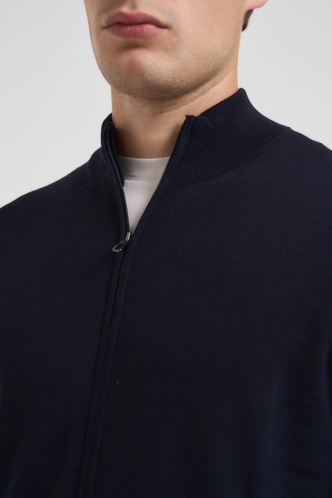 DIKTAT Maglia uomo con zip blu notte. Modello regular fit. Mezzo collo. Manica lunga. Fondo, polsi e orlo a costine. Composizione: 100% lana merino. Il modello è alto 190 cm e indossa la taglia L.