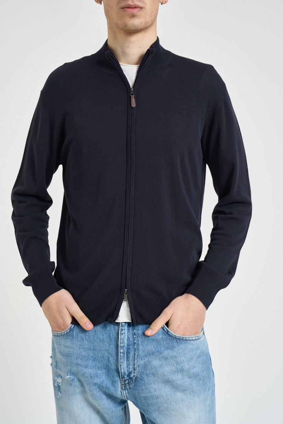 BLU CASHMERE Maglia uomo fullzip blu notte. Modello regular fit. Chiusura frontale con zip a doppio cursore. Manica lunga. Dettagli a costine. Mezzo collo. Composizione: 100% cotone. Il modello è alto 190 cm e indossa la taglia 50.