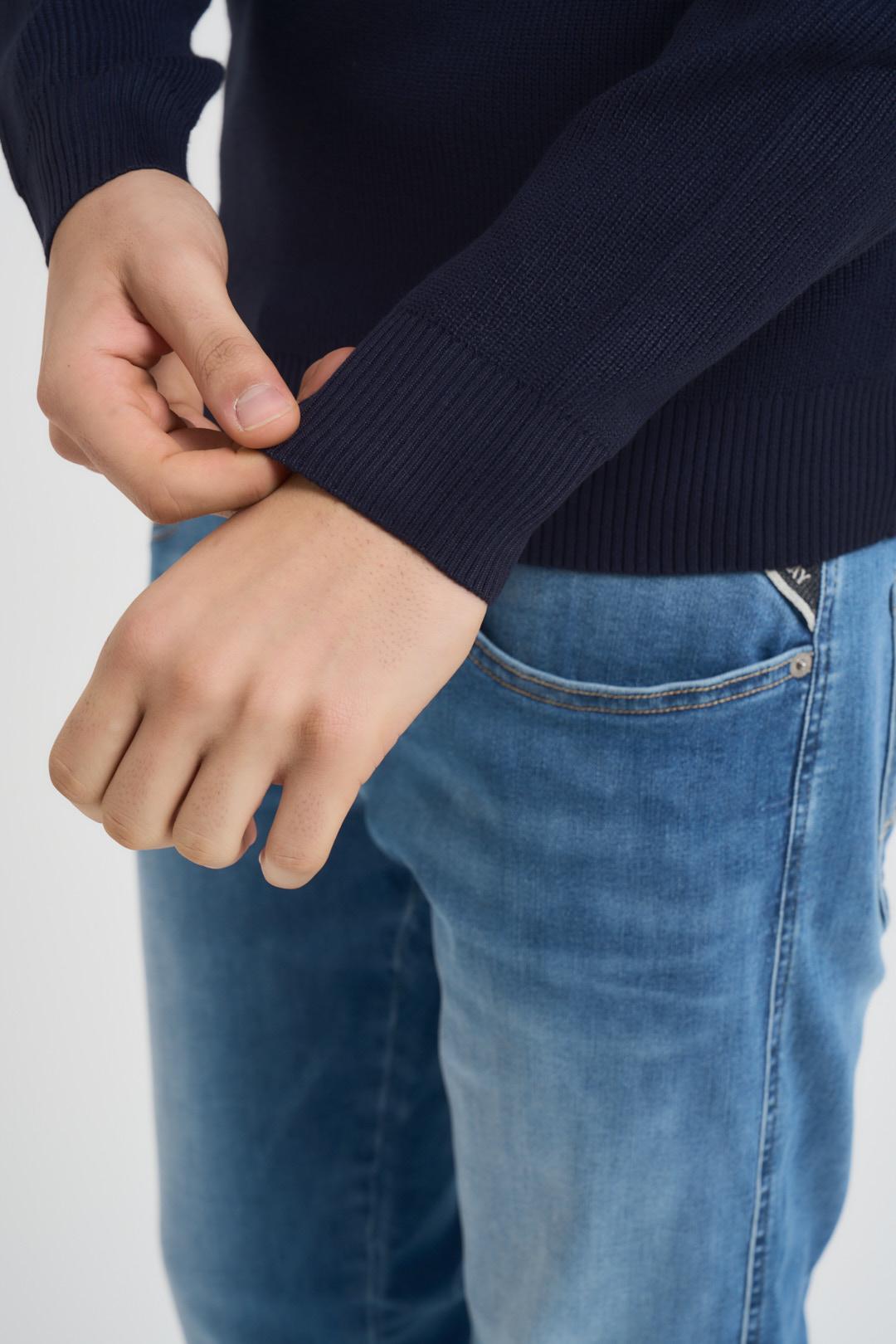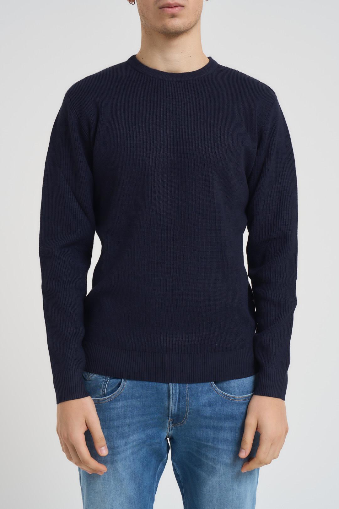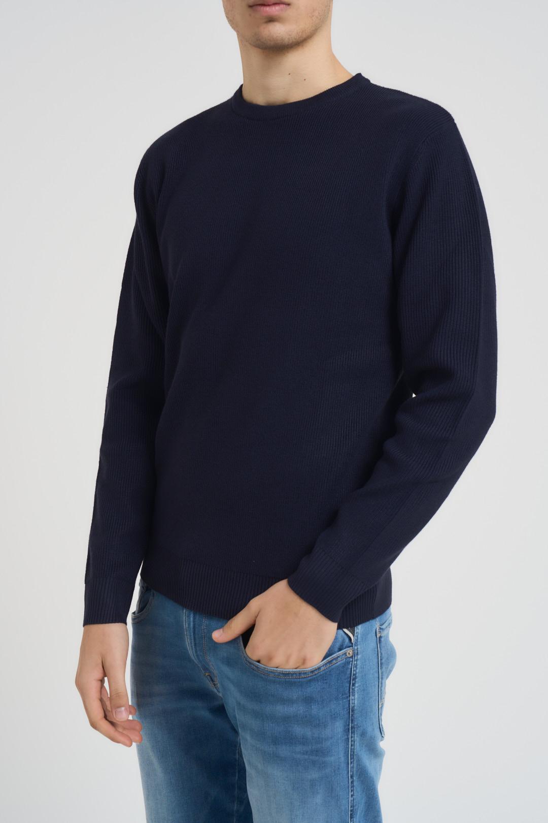 SSEINSE Maglia uomo girocollo a coste blu. Modello regular fit, manica lunga e dettagli a costine. Composizione: 70% viscosa 30% poliestere. Il modello è alto 190 cm e indossa la taglia L.