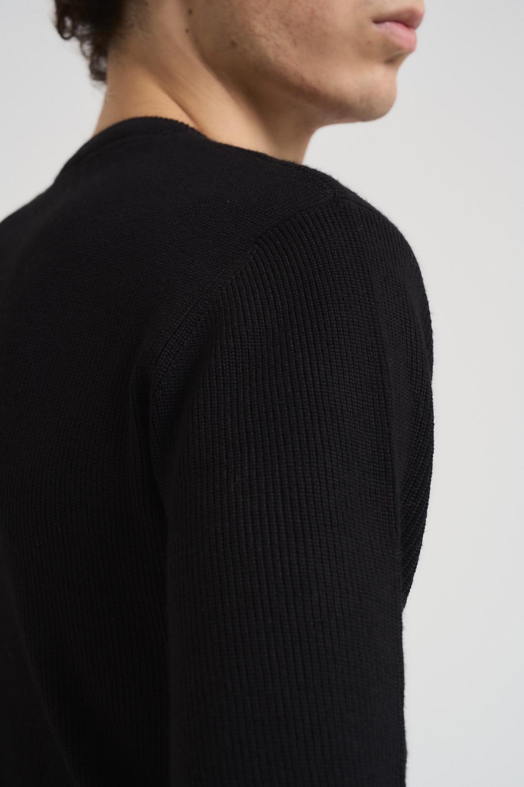 SSEINSE Maglia uomo girocollo a coste nero. Modello regular fit, manica lunga e dettagli a costine. Composizione: 70% viscosa 30% poliestere. Il modello è alto 190 cm e indossa la taglia L.