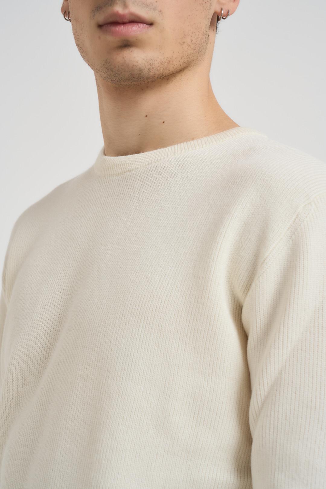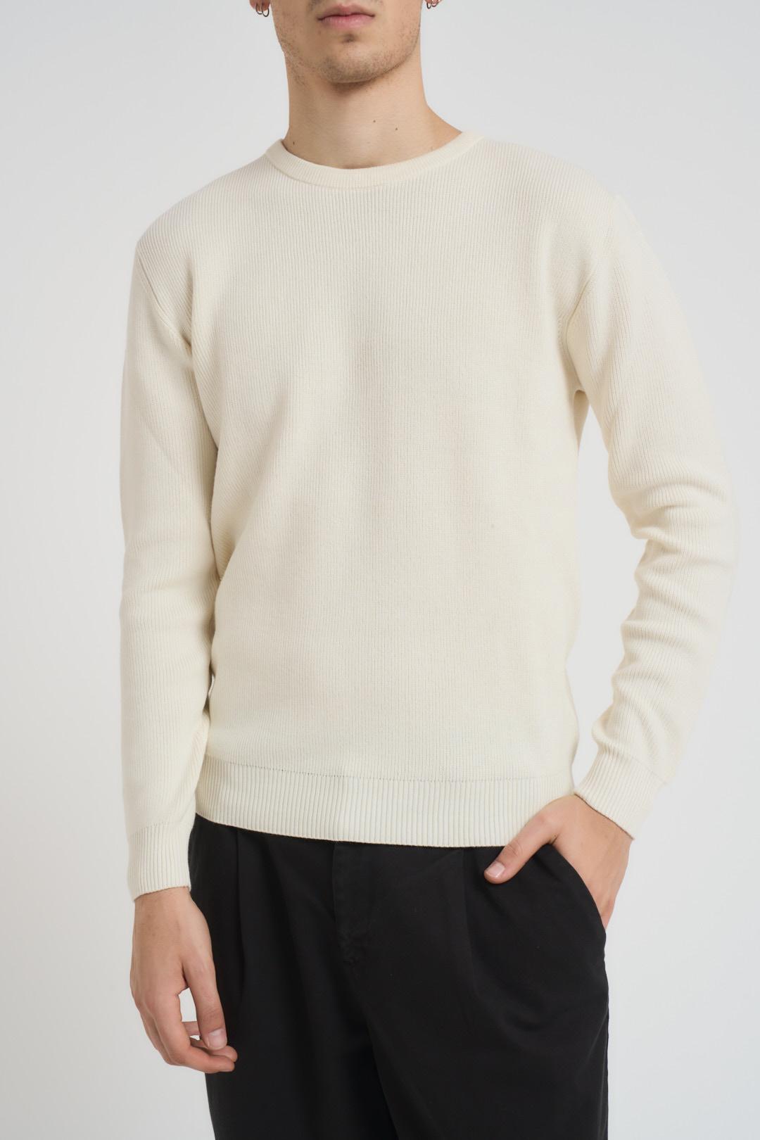 SSEINSE Maglia uomo girocollo a coste panna. Modello regular fit, manica lunga e dettagli a costine. Composizione: 70% viscosa 30% poliestere. Il modello è alto 190 cm e indossa la taglia L.