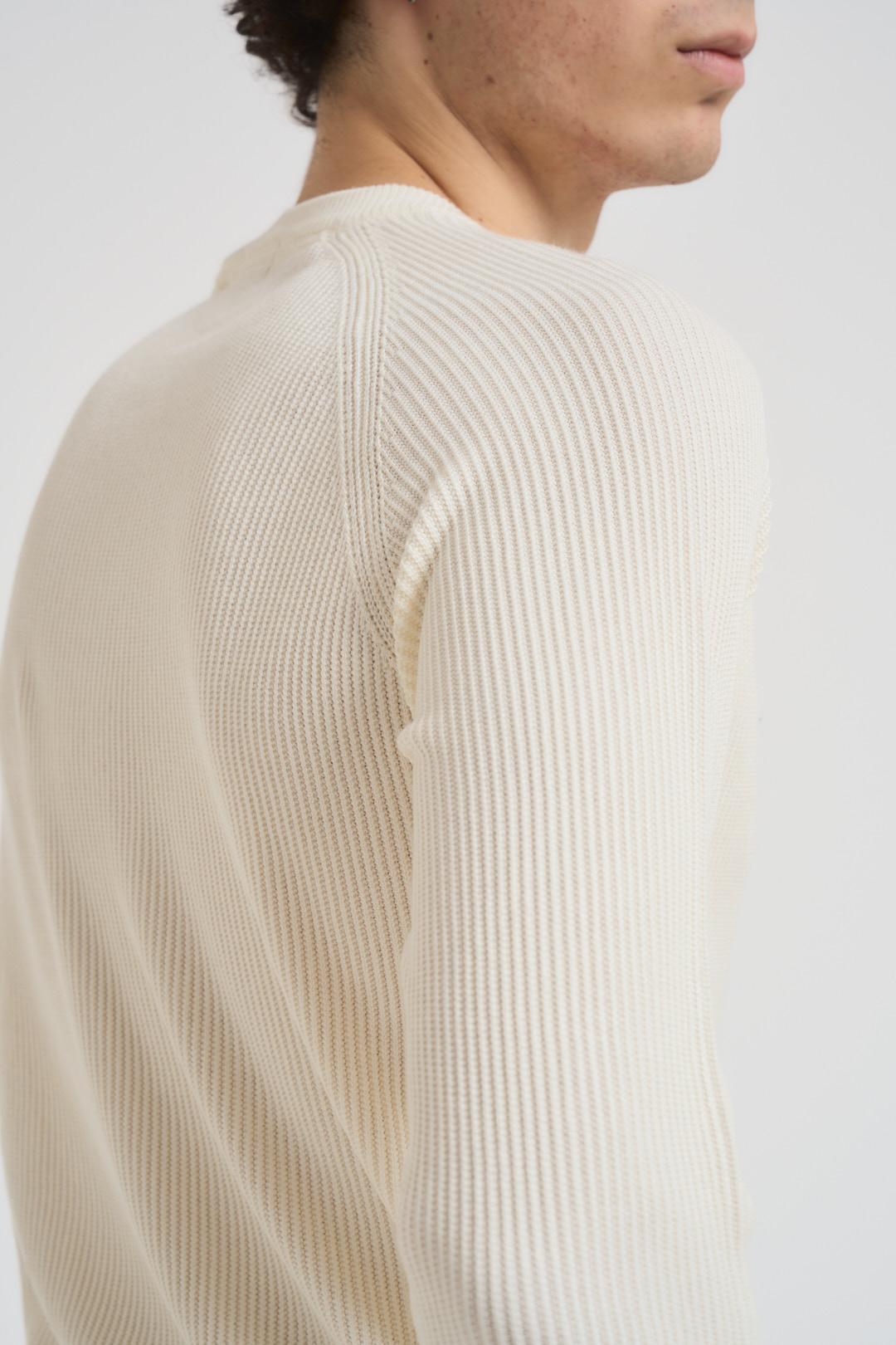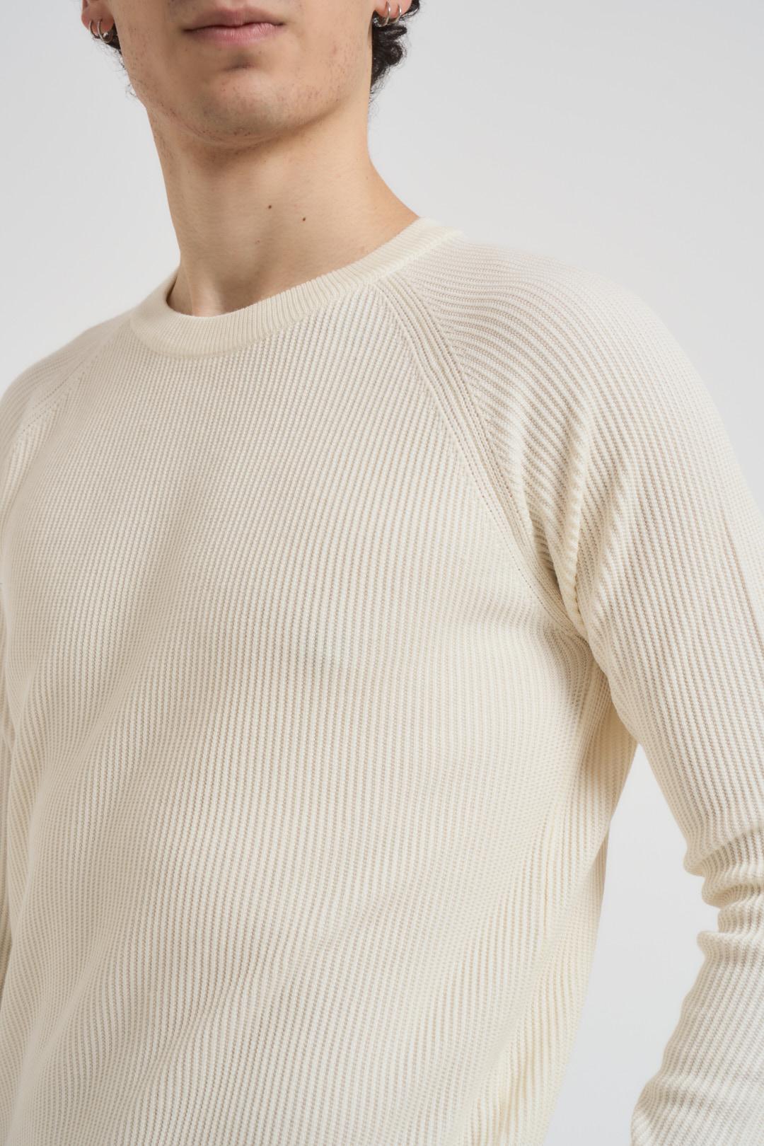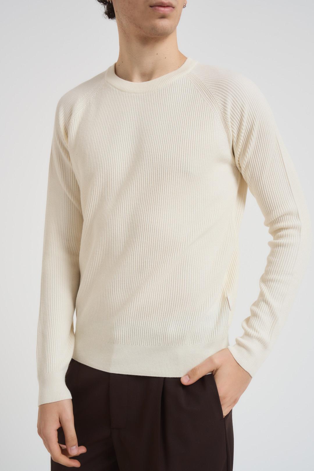 SSEINSE Maglia uomo girocollo a coste panna. Modello con maniche lunghe, dettagli a costine regular fit. Composizione: 70%viscosa 30% nylon. Il modello è alto 190cm e indossa la taglia L.
