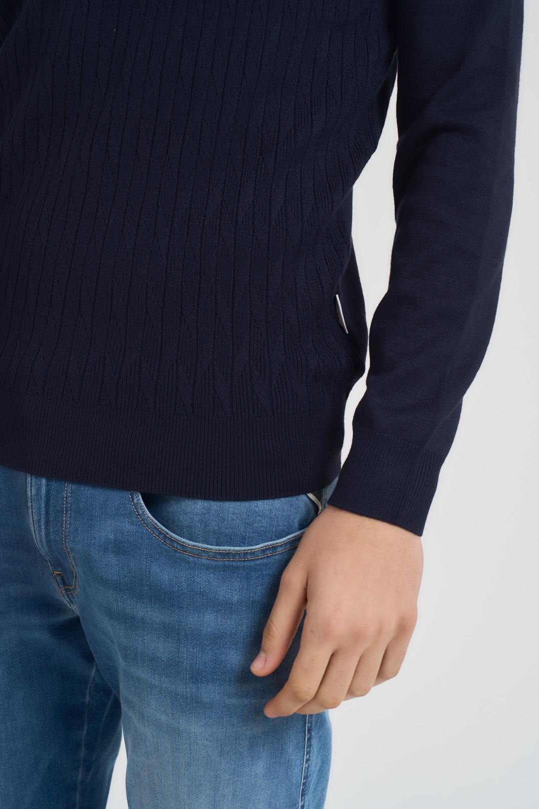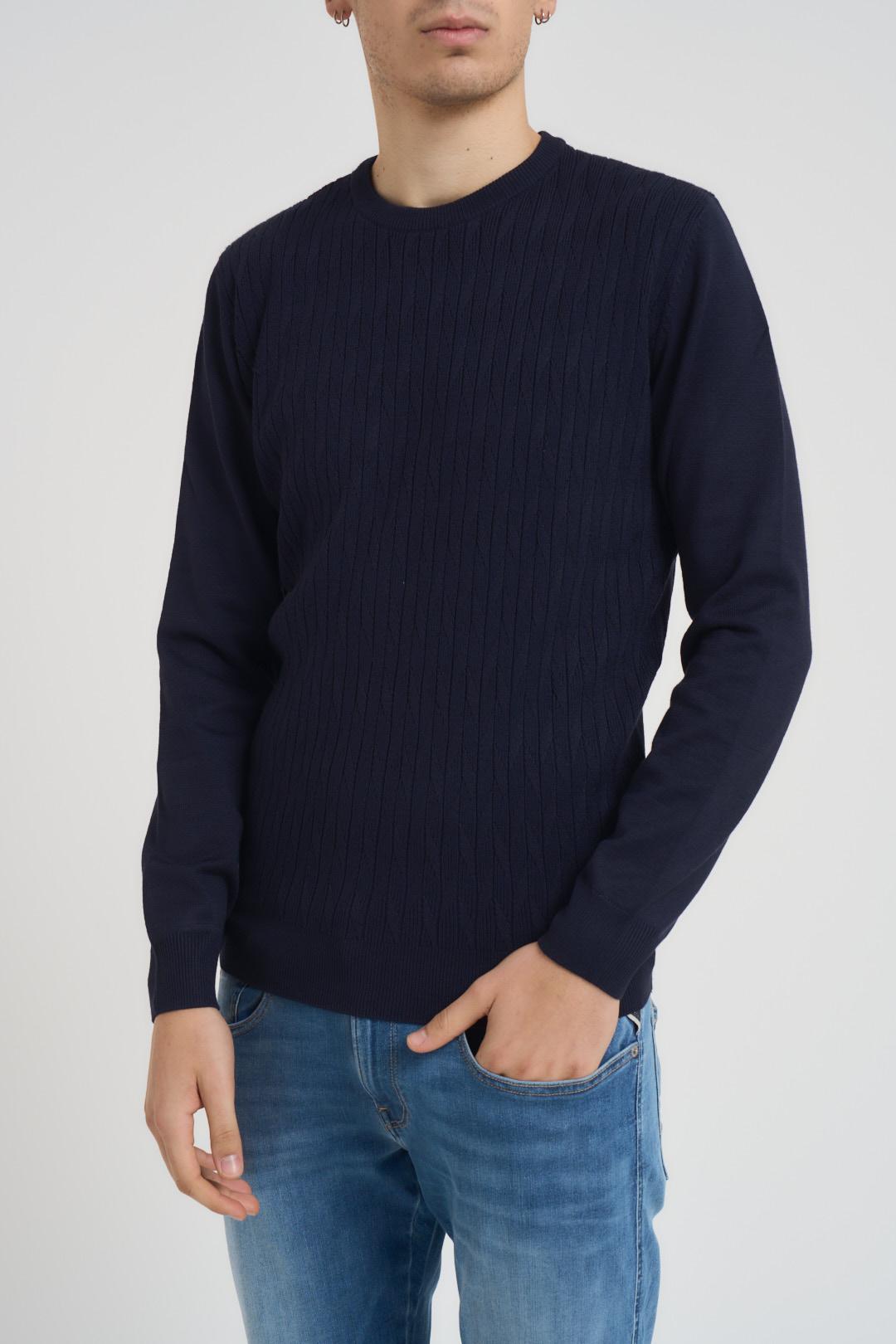 SSEINSE Maglia uomo girocollo a treccia blu. Modello amanica lunga con dettagli a costine. Composizione: viscosa. Il modello è alto 190cm e indossa la taglia L.