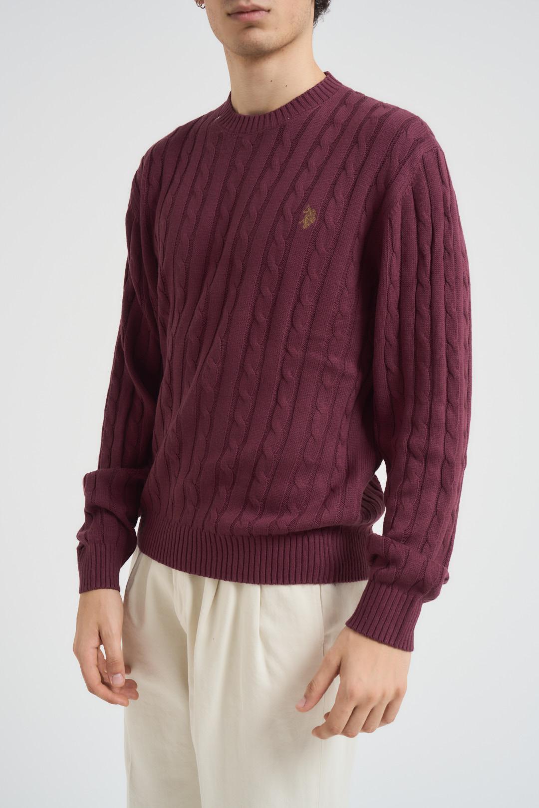U.S. POLO Maglia uomo girocollo a treccia bordeaux. Modello a maniche lunghe. Polsini, girocollo e fondo a coste. Ricamo del logo lato cuore. Composizione: 80% Lana 20% Poliammide. Il modello è alto 190 cm e indossa la taglia L.