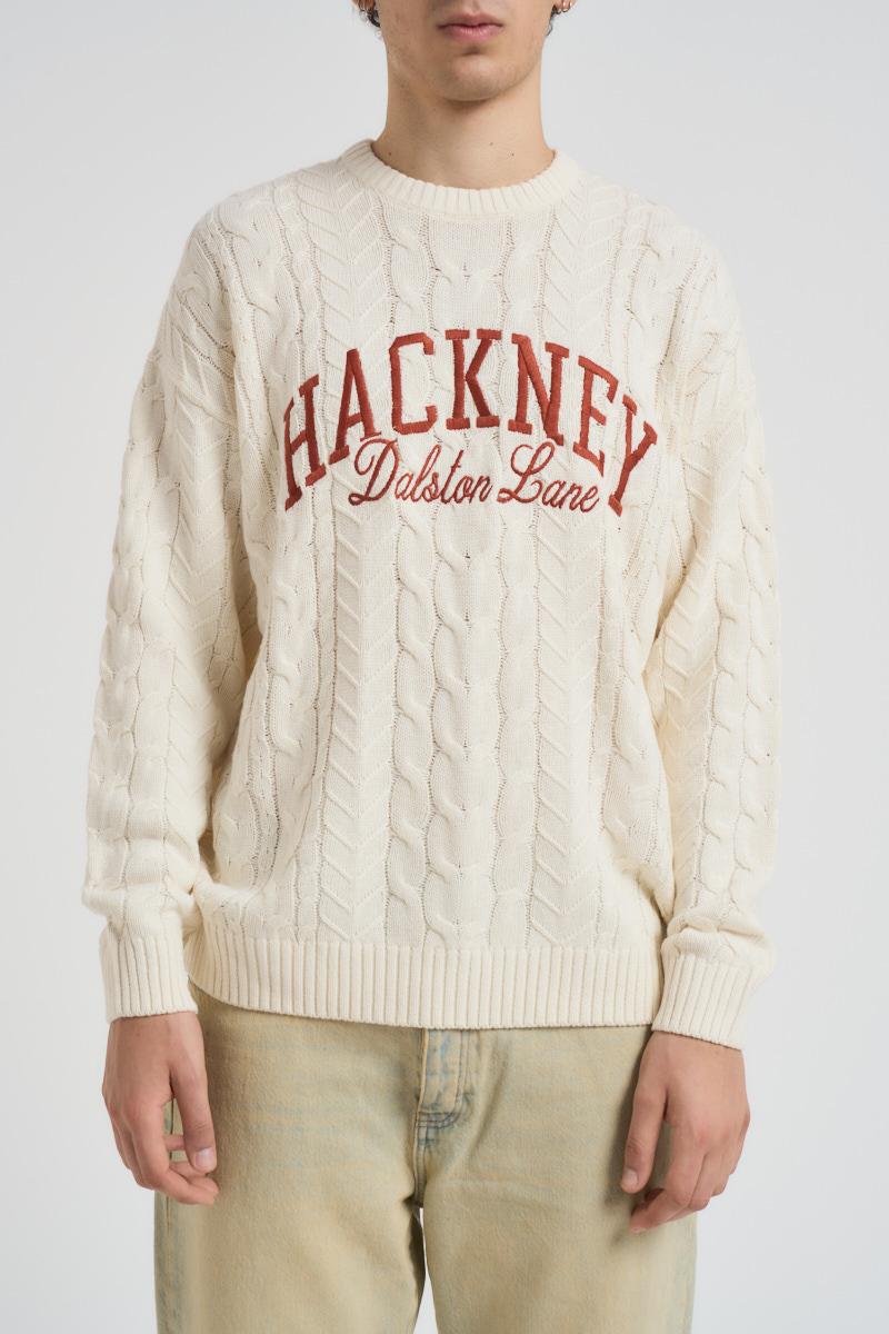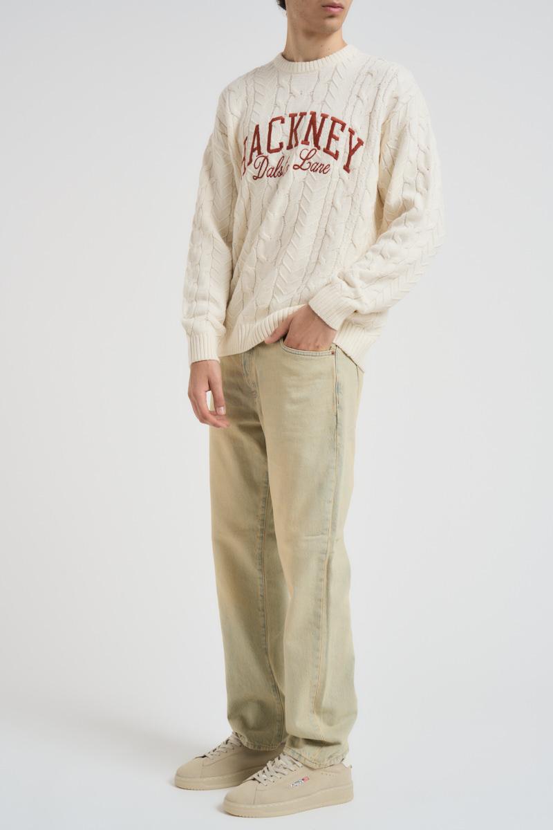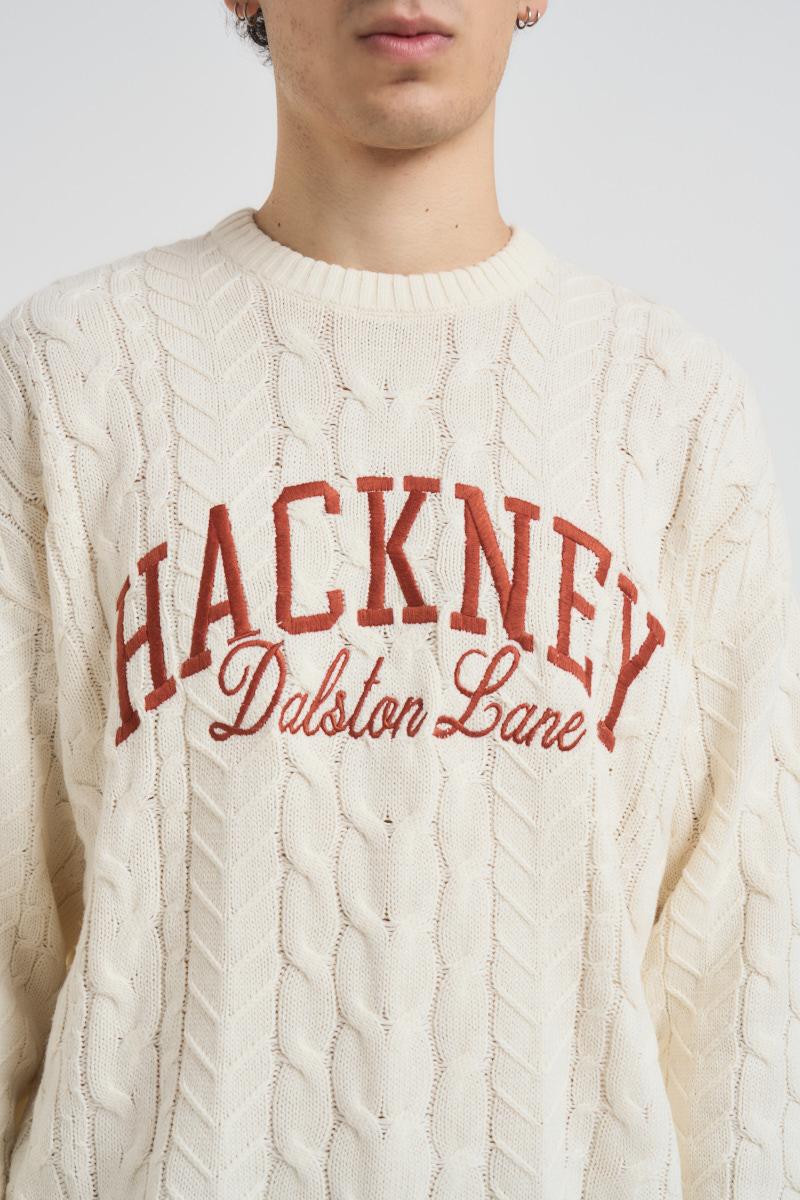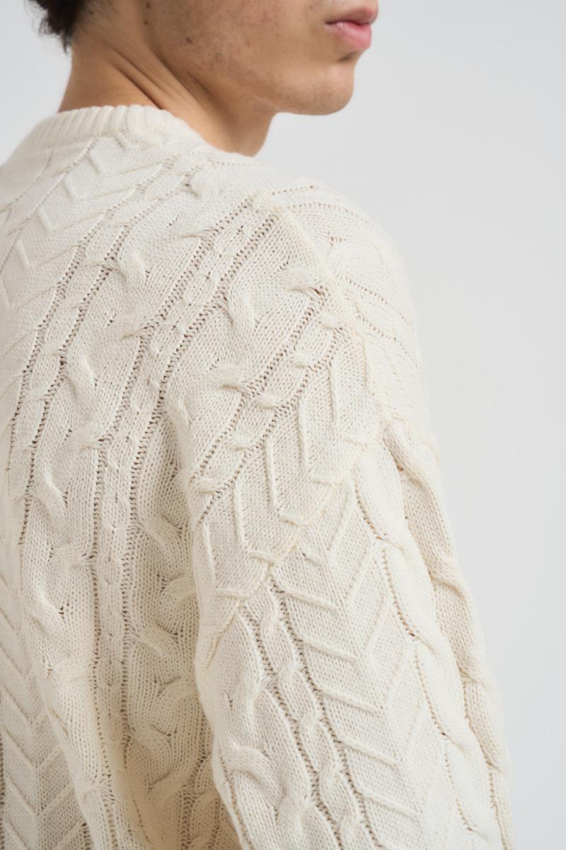 ONLY&SONS Maglia uomo girocollo a treccia panna. Modello a maniche lunghe con dettaglio ricamato in arancione. Relaxed Fit. Composizione: 60% Cotone 40% Acrilico. Il modello è alto 190 cm e indossa la taglia L.