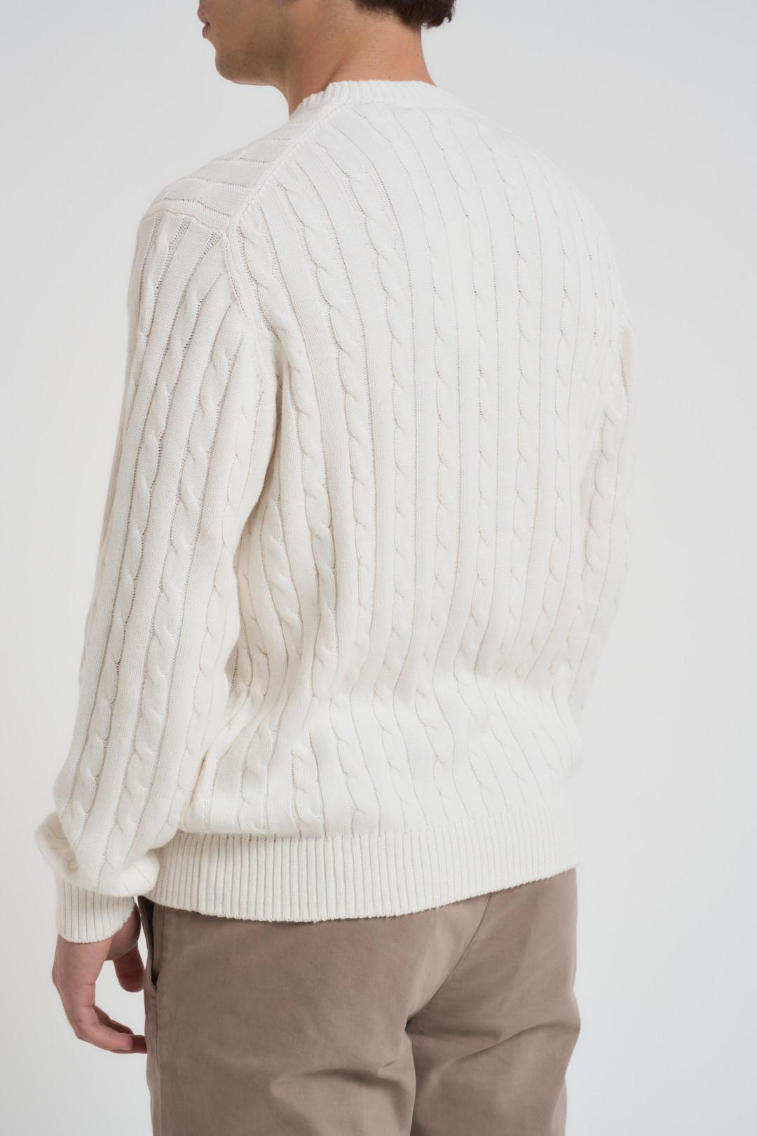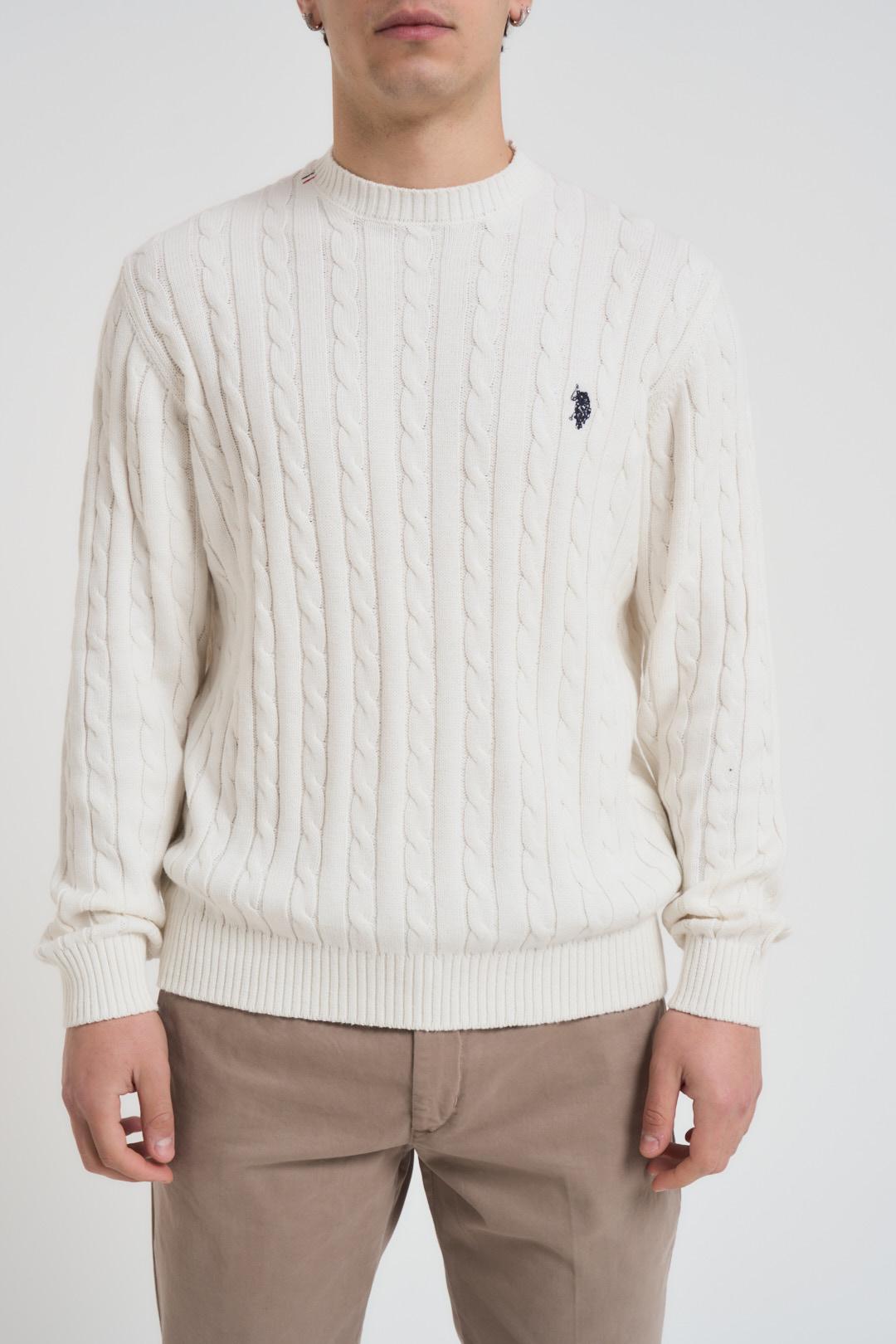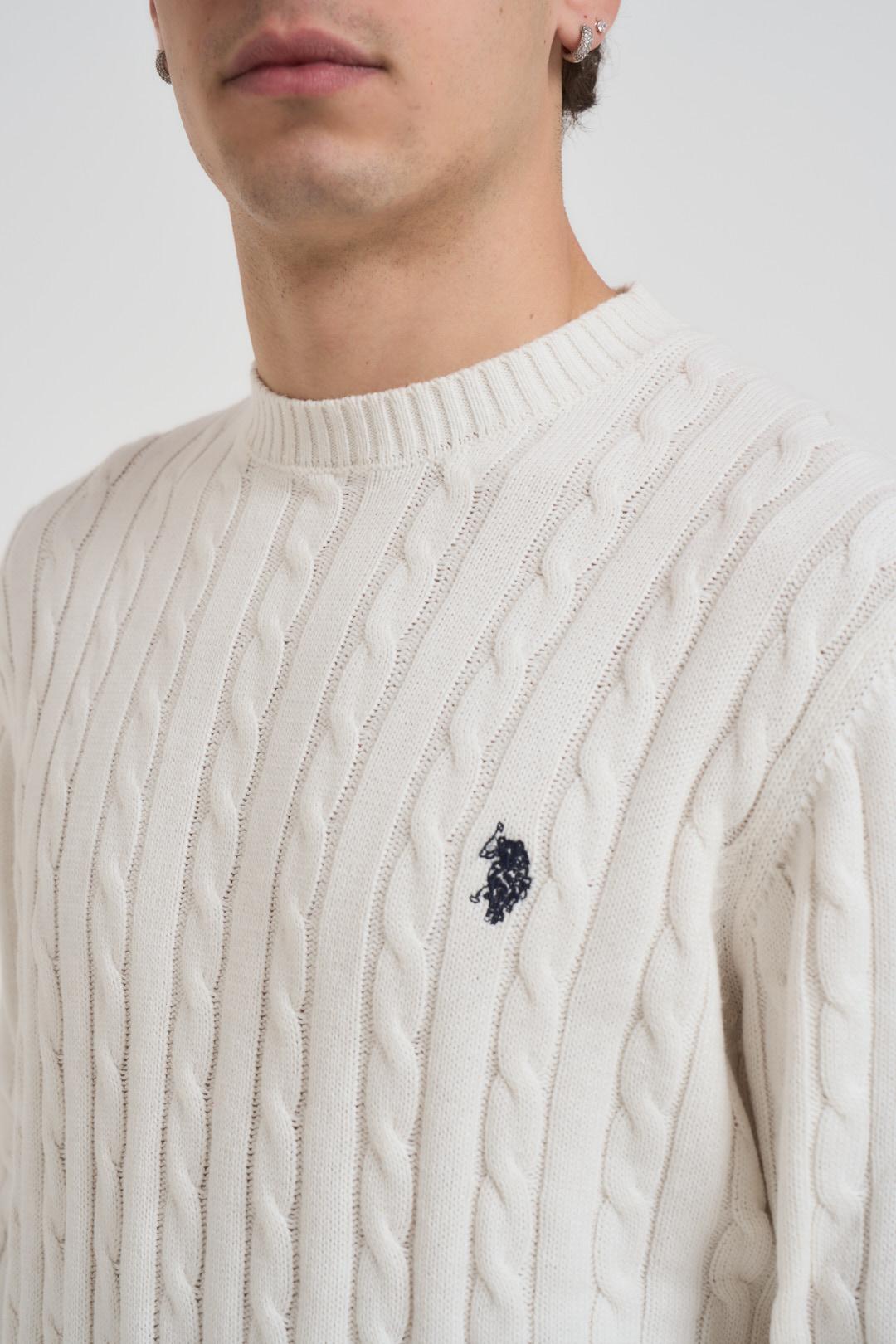 U.S. POLO Maglia uomo girocollo a treccia panna. Modello a maniche lunghe. Polsini, girocollo e fondo a coste. Ricamo del logo lato cuore. Composizione: 90% cotone 10% cashmere. Il modello è alto 190 cm e indossa la taglia L.