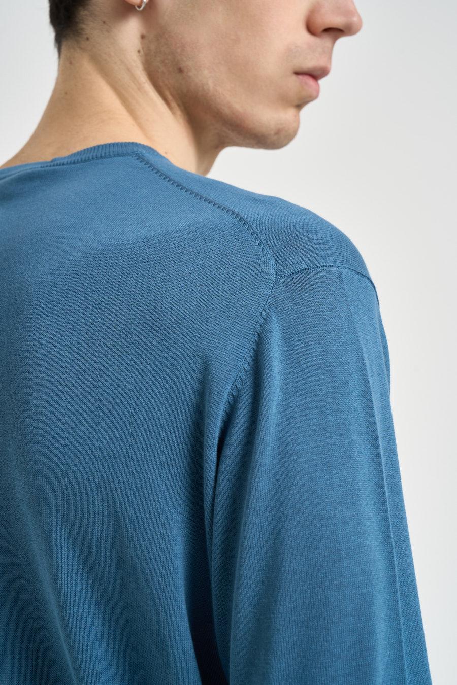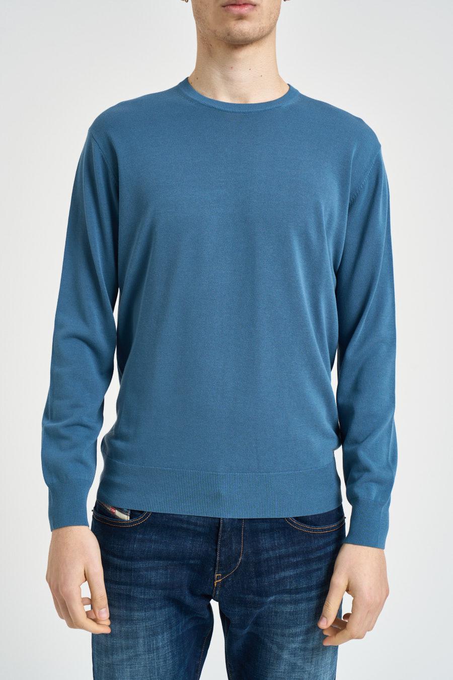 BLU CASHMERE Maglia uomo girocollo azzurro. Modello regular fit. Manica lunga. Dettagli a costine. Composizione: 100% cotone. Il modello è alto 190 cm e indossa la taglia 50.
