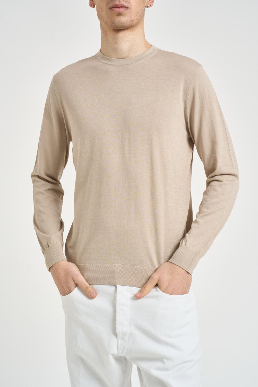 DIKTAT Maglia uomo girocollo beige. Modello in cotone di finezza 18, maniche lunghe, girocollo e regular fit. Composizione: 100% cotone. Il modello è alto 190 cm e indossa la taglia 50.