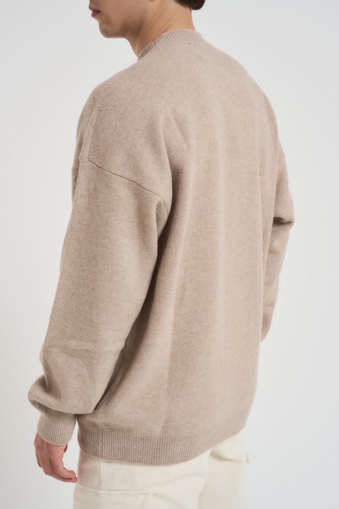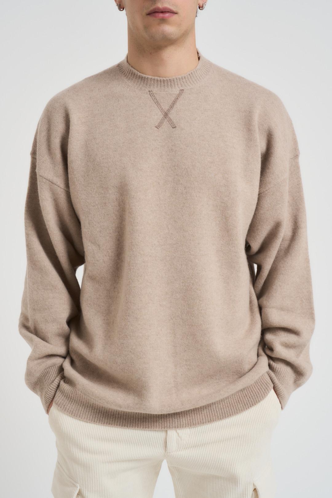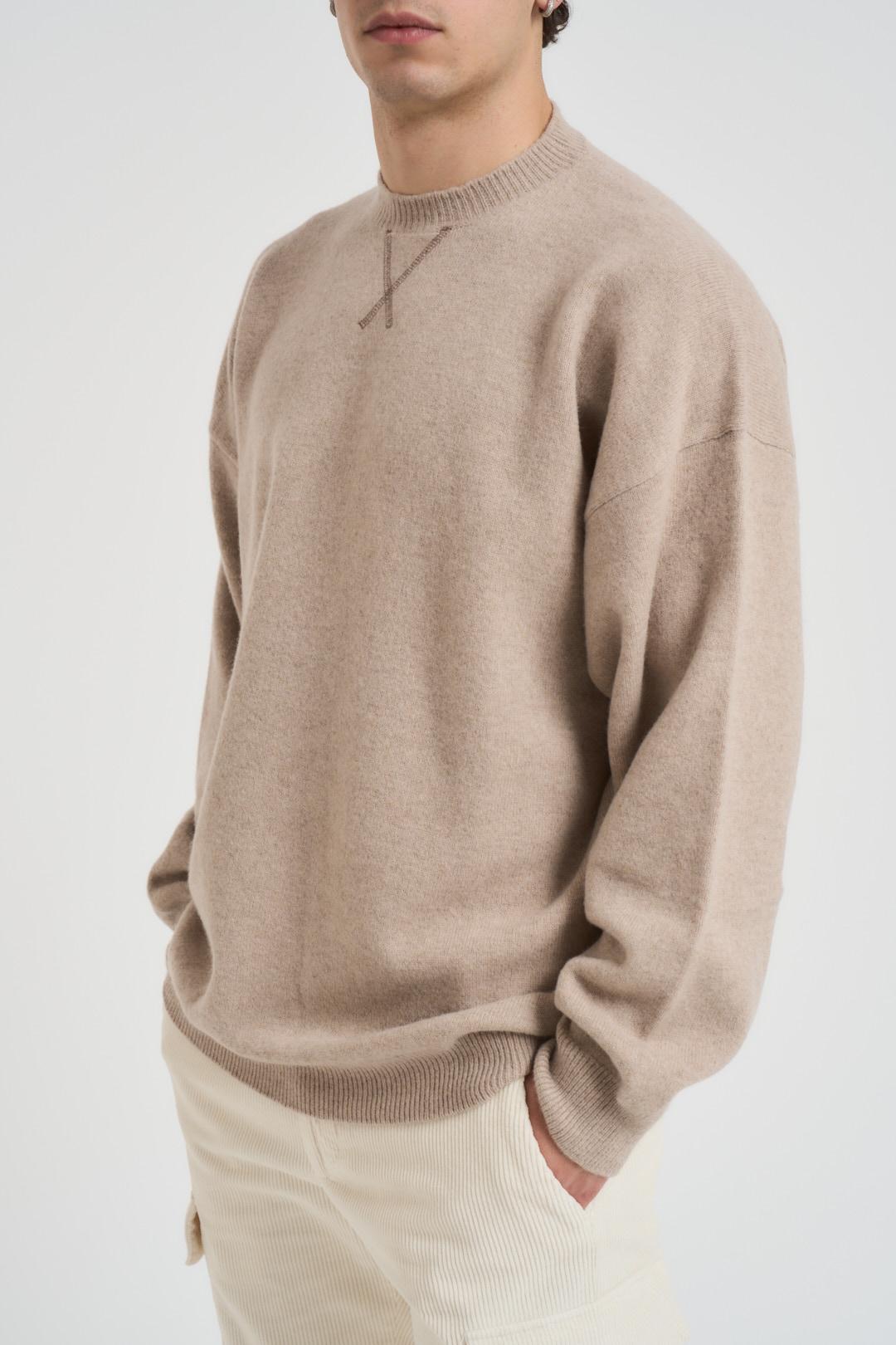 AMARANTO Maglia uomo girocollo beige. Modello regular fit. Dettaglio a contrasto sul collo e su fondo. Manica lunga. Collo, polsi e orlo a costine. Composizione: 100% lana. Il modello è alto 190 cm e indossa la taglia L.