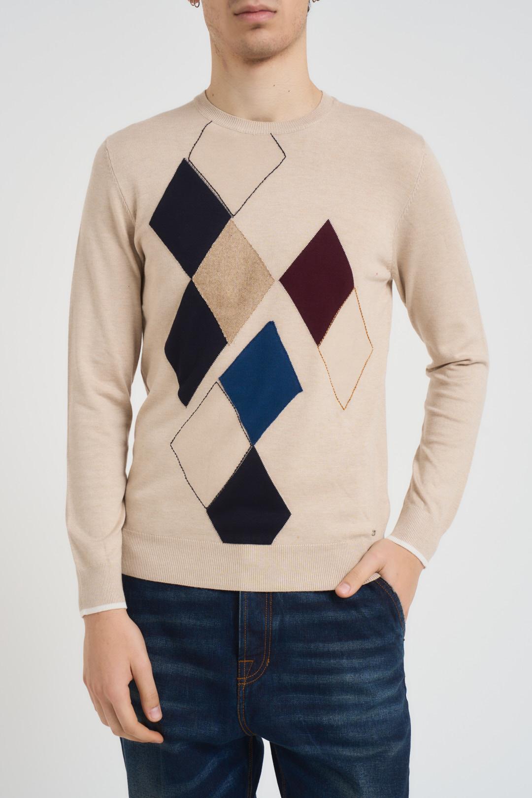 MARKUP Maglia uomo girocollo beige. Modello slim fit. Fantasia con rombi. Manica lunga. Collo, polsini e orlo con lavorazione a costine. Targhetta logo applicata frontalmente nel lato sinistro. Composizione: 80% Viscosa, 20% Nylon. Il modello è alto 190 cm e indossa la taglia L.