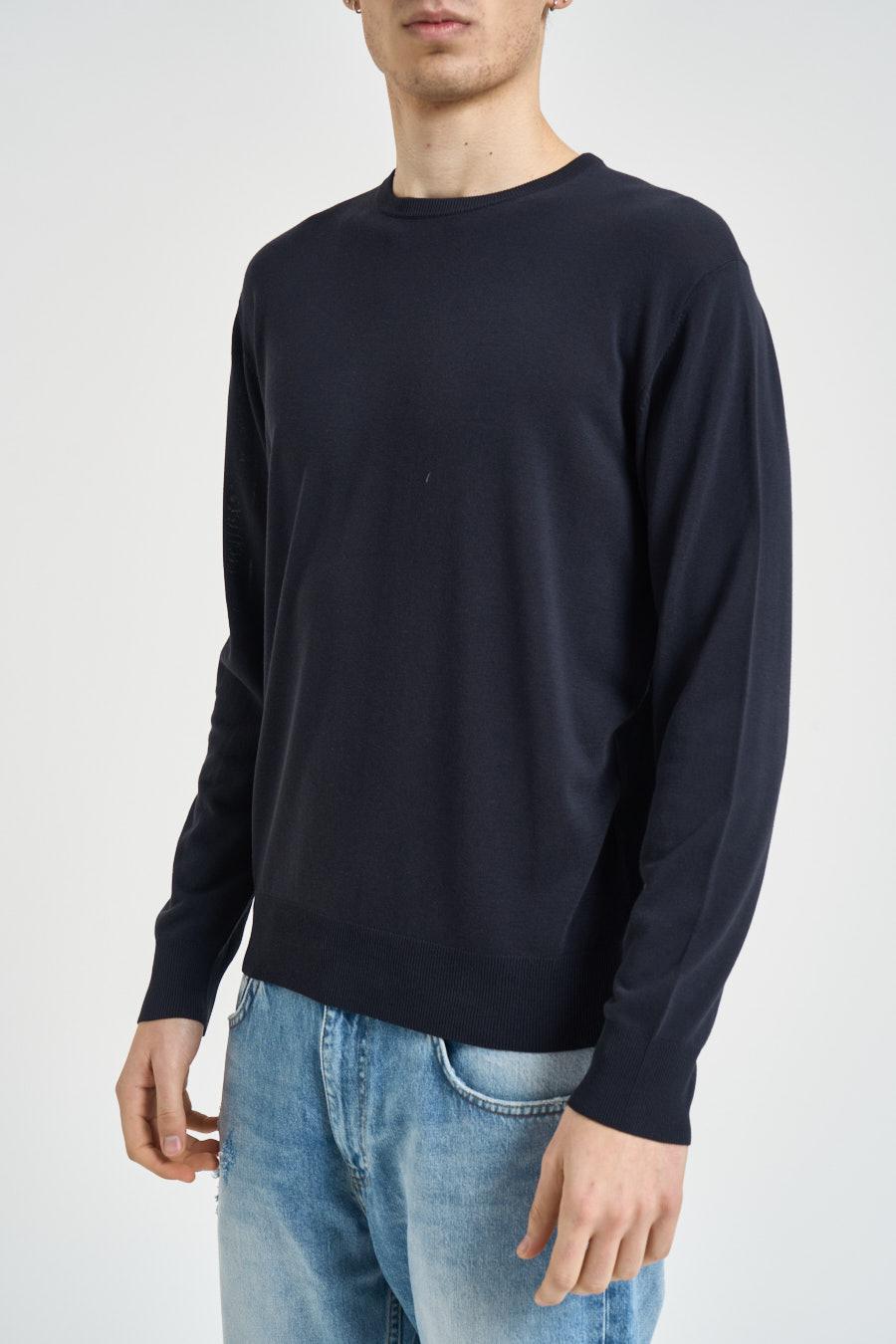 BLU CASHMIR Maglia uomo girocollo blu. Modello regular fit. Manica lunga. Dettagli a costine. Composizione: 100% cotone. Il modello è alto 190 cm e indossa la taglia 50.