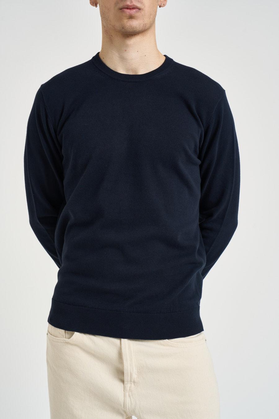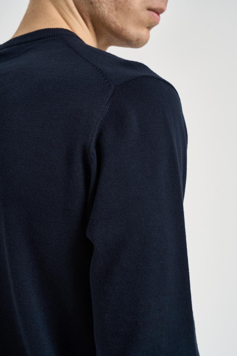VITTORIO FERRIERI Maglia uomo girocollo blu notte. Modello maniche lunghe, finiture a costine su collo, polsi e fondo che valorizzano la silhouette. Composizione: 100% Cotone. Il modello è alto 190 cm e indossa la taglia L.
