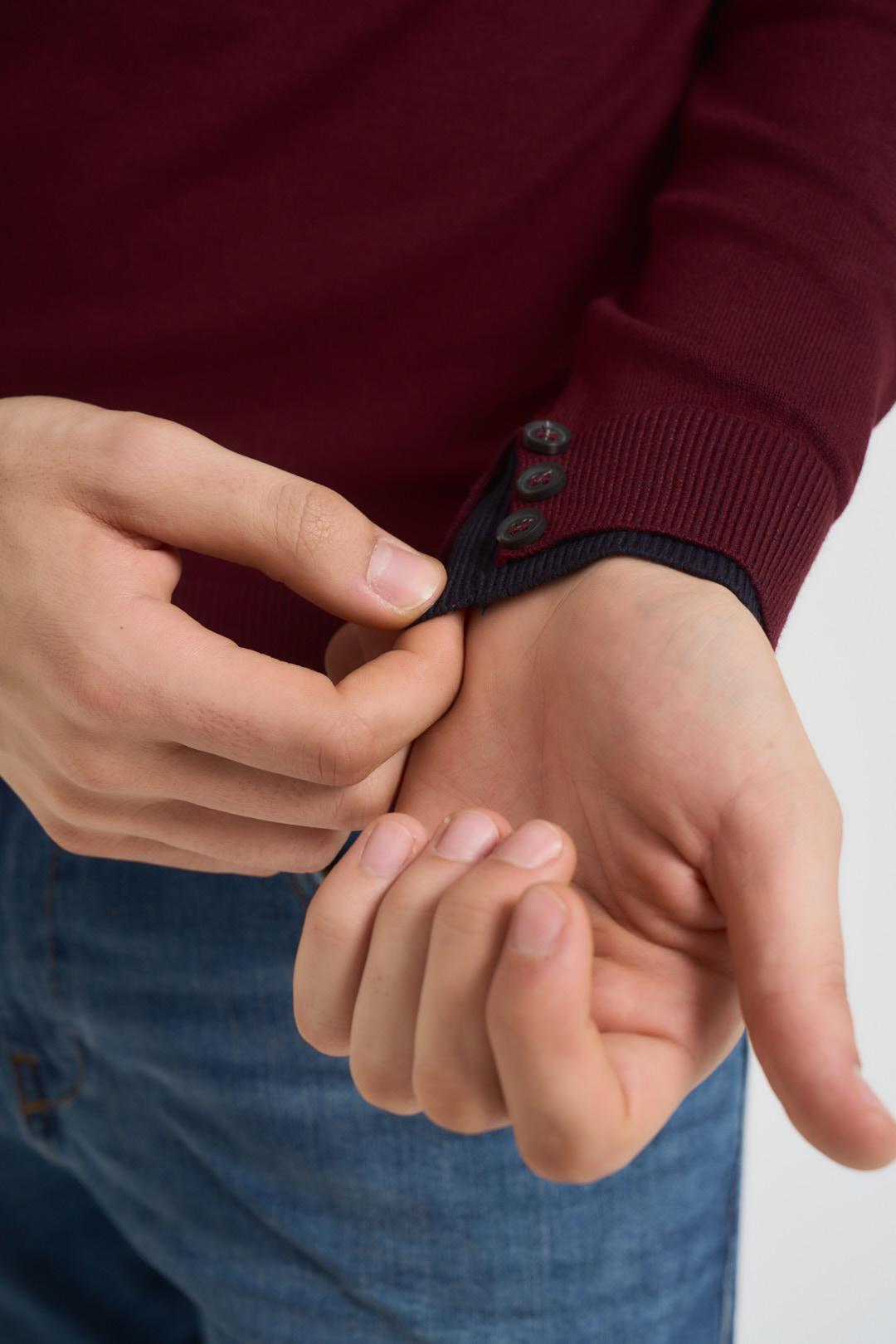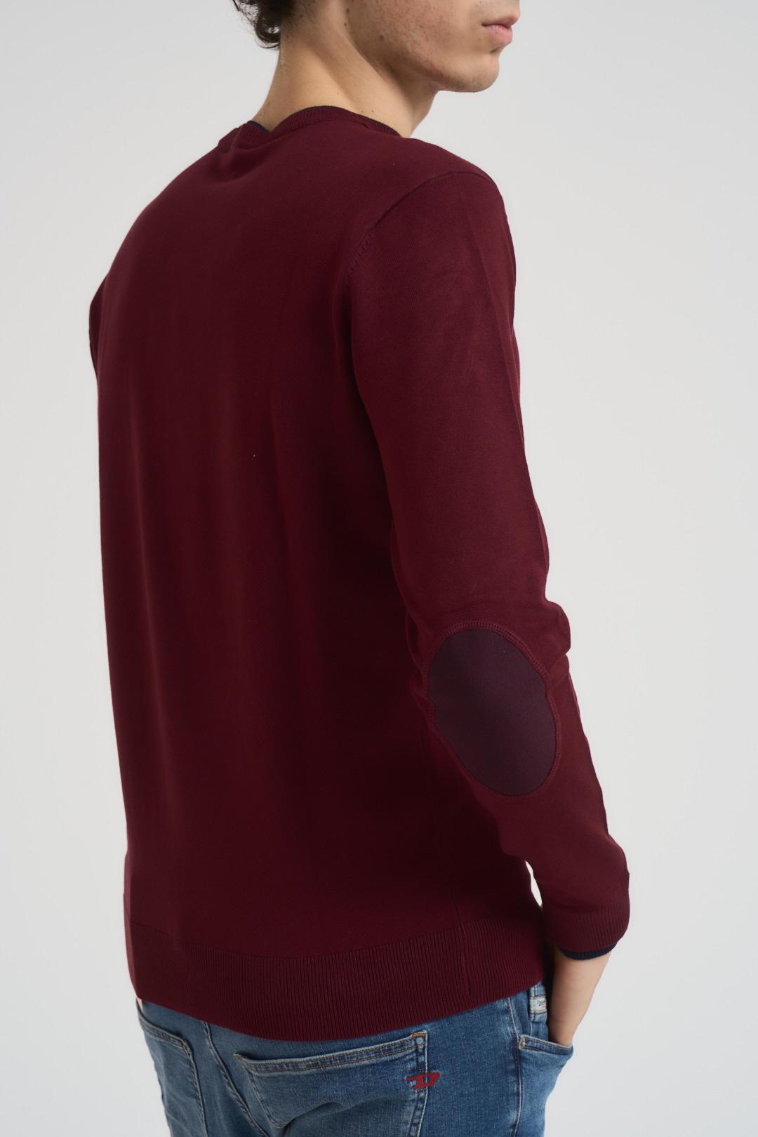 AGOEFILO Maglia uomo girocollo bordeaux. Modello con doppio collo e polsino grigio a costine con bottoncini. Regular fit. Composizione: misto cotone. Il modello è alto 190cm e indossa la taglia L.