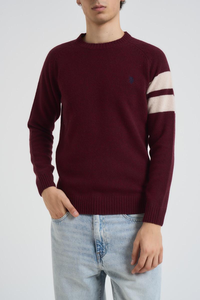 U.S POLO Maglia uomo girocollo bordeaux. Modello a con due strisce panna sulla manica a sinistra. Logo ricamato sul petto. Composizione: 100% lana vergine. Il modello è alto 190 cm e indossa la taglia L.