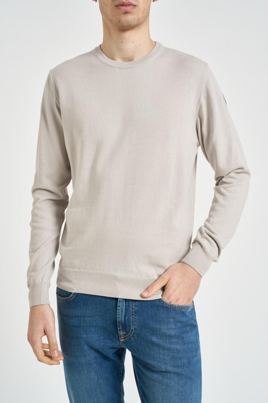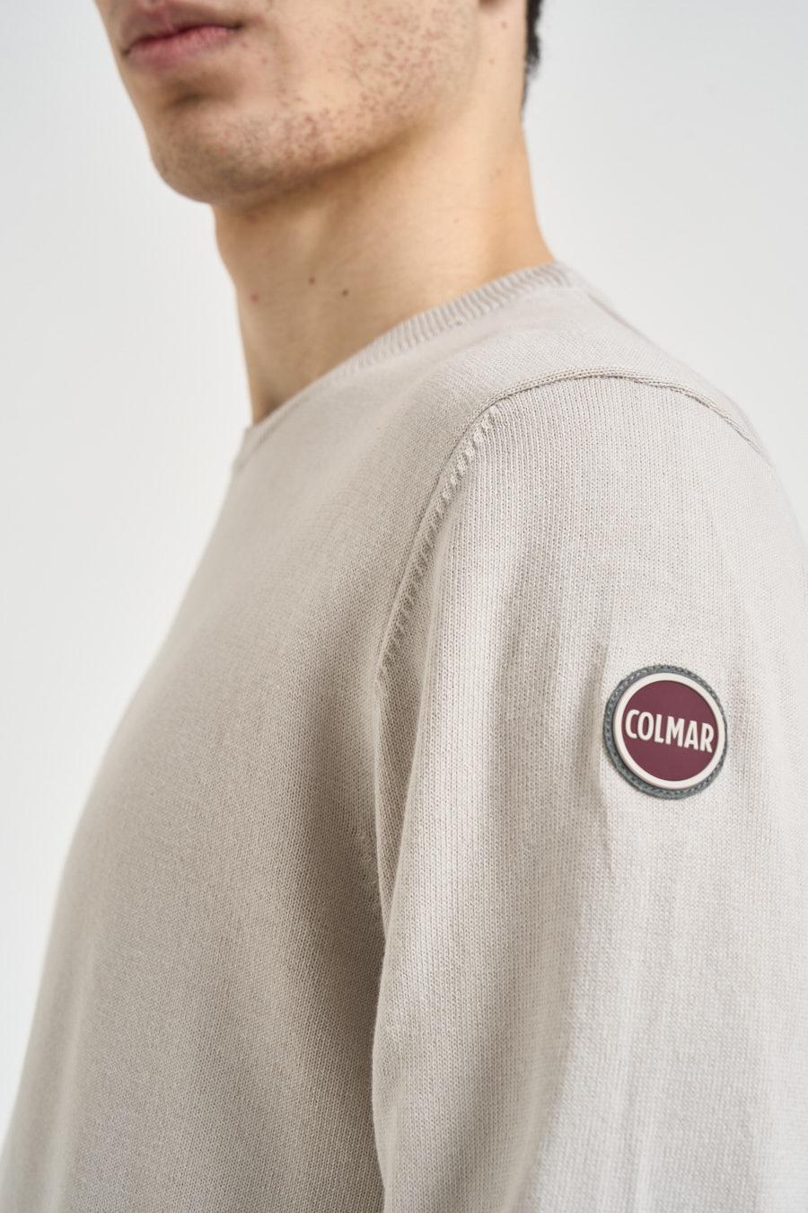 COLMAR Maglia uomo girocollo burro. Modello girocollo e maniche lunghe, caratterizzato da una vestibilità regolare. Realizzata in maglia leggera e morbida, presenta collo, polsi e fondo rifiniti a costine. Sulla manica è presente patch logo circolare a contrasto. Composizione: 100% cotone. Il modello è alto 190 cm e indossa la taglia L.