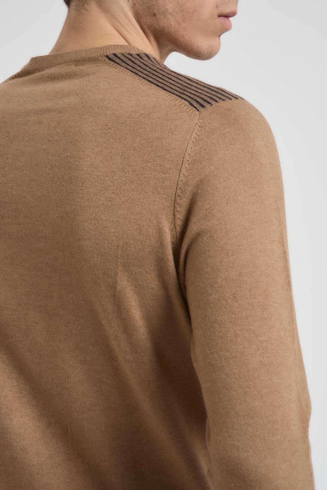 MARKUP Maglia uomo girocollo cammello. Modello regular fit. Collo, polsi e orlo con lavorazione a costine. Dettaglio su spalla. Composizione: 80% Viscosa, 20% Nylon. Il modello è alto 190 cm e indossa la taglia L.